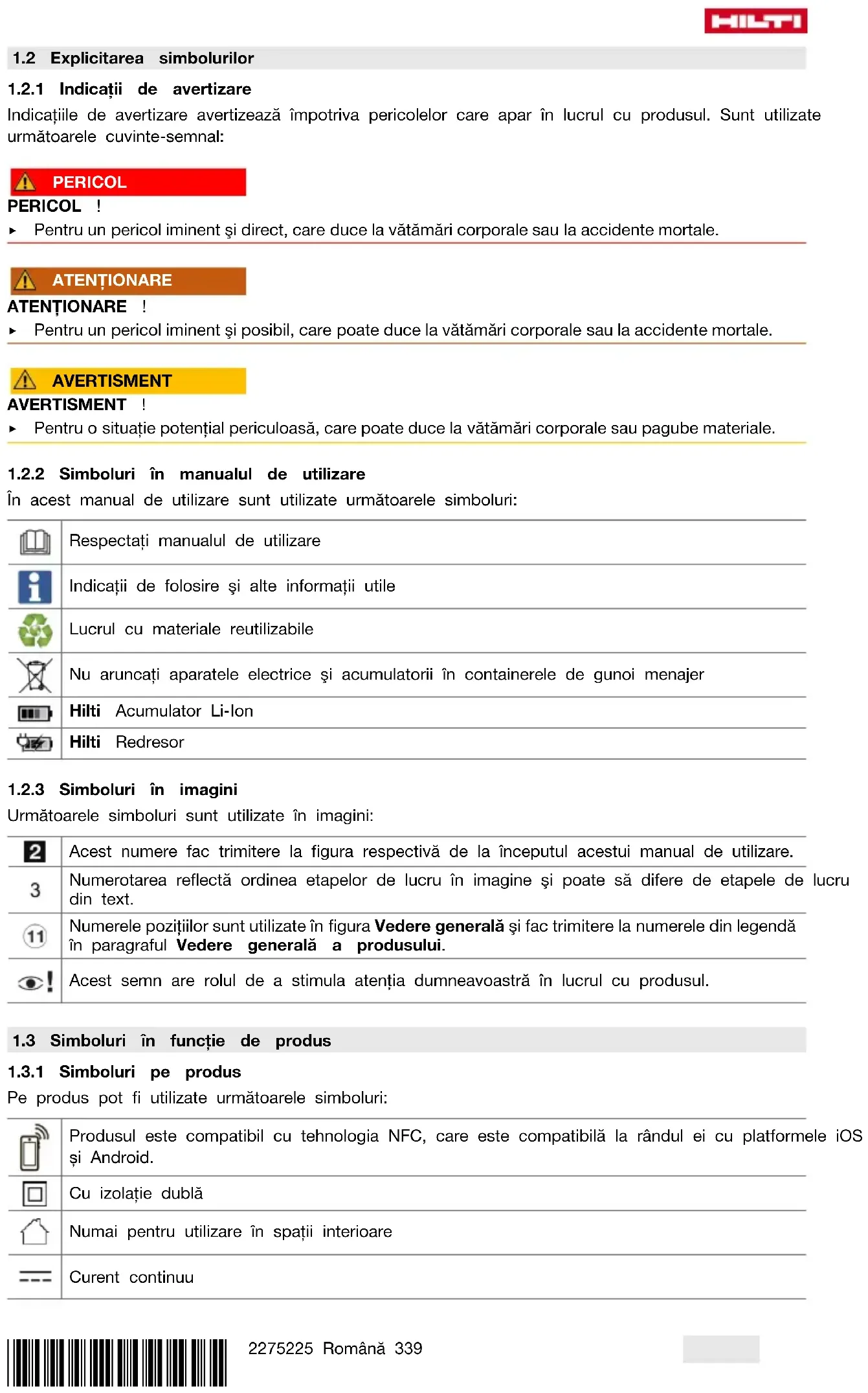 În acest manual de utilizare sunt utilizate următoarele simboluri: Respectaţi manualul de utilizare Indicaţii de folosire şi alte informaţii utile Lucrul cu materiale reutilizabile Nu aruncaţi aparatele electrice şi acumulatorii în containerele de gunoi menajer Hilti Acumulator LiIon Hilti Redresor