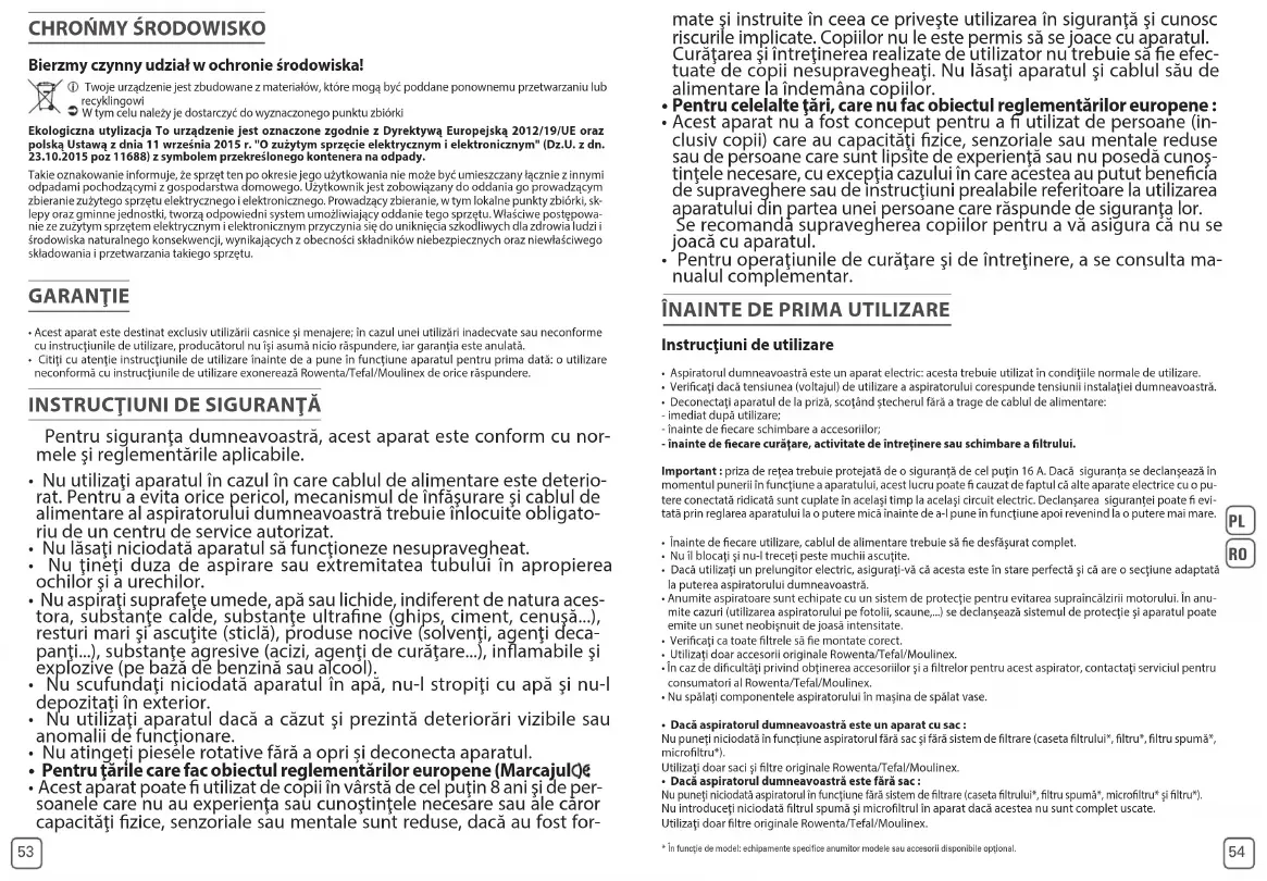 - În caz de dicultăţi privind obţinerea accesoriilor şi a ltrelor pentru acest aspirator, contactaţi serviciul pentru consumatori al Rowenta/Tefal/Moulinex. • Nu spălați componentele aspiratorului în mașina de spălat vase.• Dacă aspiratorul dumneavoastră este un aparat cu sac : Nu puneţi niciodată în funcţiune aspiratorul fără sac şi fără sistem de ltrare (caseta ltrului*, ltru*, ltru spumă*, microltru*).Utilizaţi doar saci şi ltre originale Rowenta/Tefal/Moulinex. • Dacă aspiratorul dumneavoastră este fără sac : Nu puneţi niciodată aspiratorul în funcţiune fără sistem de ltrare (caseta ltrului*, ltru spumă*, microltru* şi ltru*). Nu introduceţi niciodată ltrul spumă şi microltrul în aparat dacă acestea nu sunt complet uscate.Utilizaţi doar ltre originale Rowenta/Tefal/Moulinex. GARANŢIE