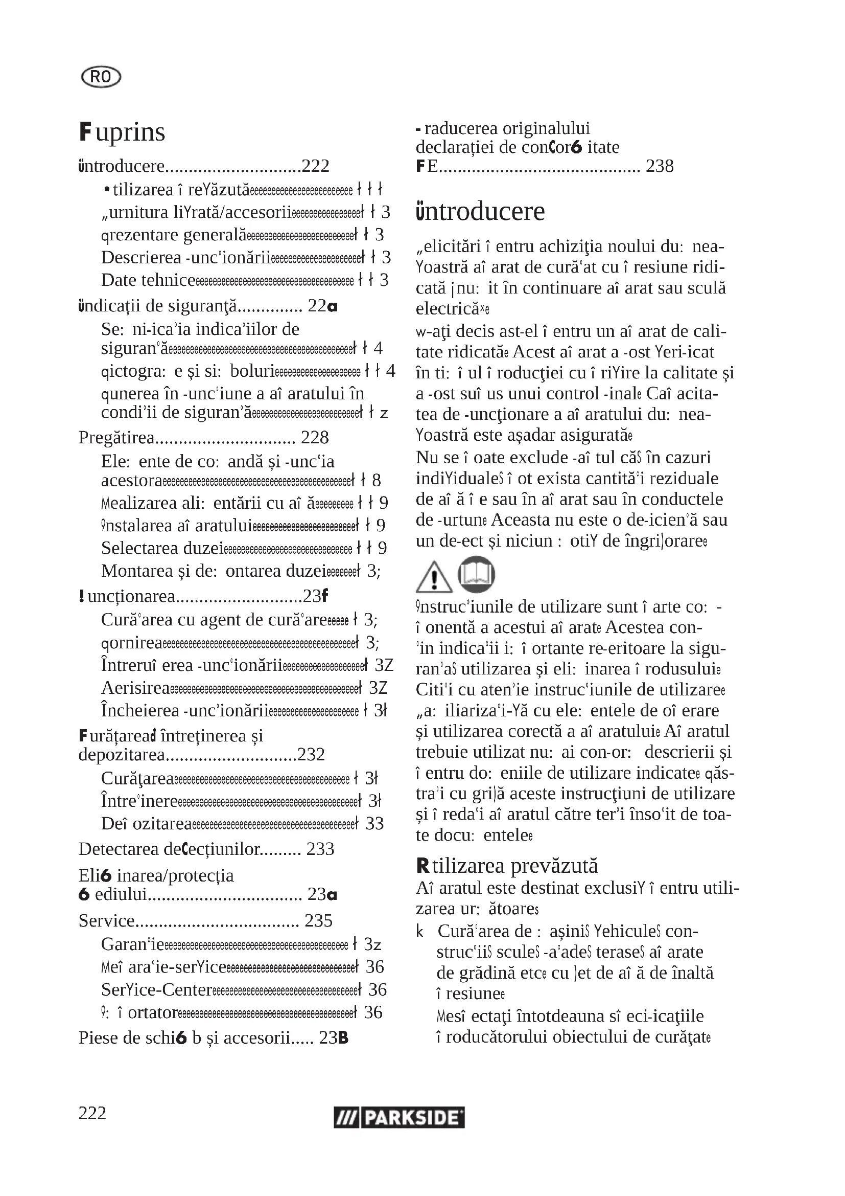 - Traducerea originalului declarației de conformitate CE Introducere Felicitări pentru achiziţia noului dumnea- voastră aparat de curățat cu presiune ridi- cată (numit în continuare aparat sau sculă electrică). V-aţi decis astfel pentru un aparat de cali- tate ridicată. Acest aparat a fost verificat în timpul producţiei cu privire la calitate și a fost supus unui control final. Capacita- tea de funcţionare a aparatului dumnea- voastră este așadar asigurată. Nu se poate exclude faptul că, în cazuri individuale, pot exista cantități reziduale de apă pe sau în aparat sau în conductele de furtun. Aceasta nu este o deficiență sau un defect și niciun motiv de îngrijorare. Instrucțiunile de utilizare sunt parte com- ponentă a acestui aparat. Acestea con- țin indicații importante referitoare la sigu- ranța, utilizarea și eliminarea produsului. Citiți cu atenție instrucțiunile de utilizare. Familiarizați-vă cu elementele de operare și utilizarea corectă a aparatului. Aparatul trebuie utilizat numai conform descrierii și pentru domeniile de utilizare indicate. Păs- trați cu grijă aceste instrucţiuni de utilizare și predați aparatul către terți însoțit de toa- te documentele. Utilizarea prevăzută Aparatul este destinat exclusiv pentru utili- zarea următoare: p. 238