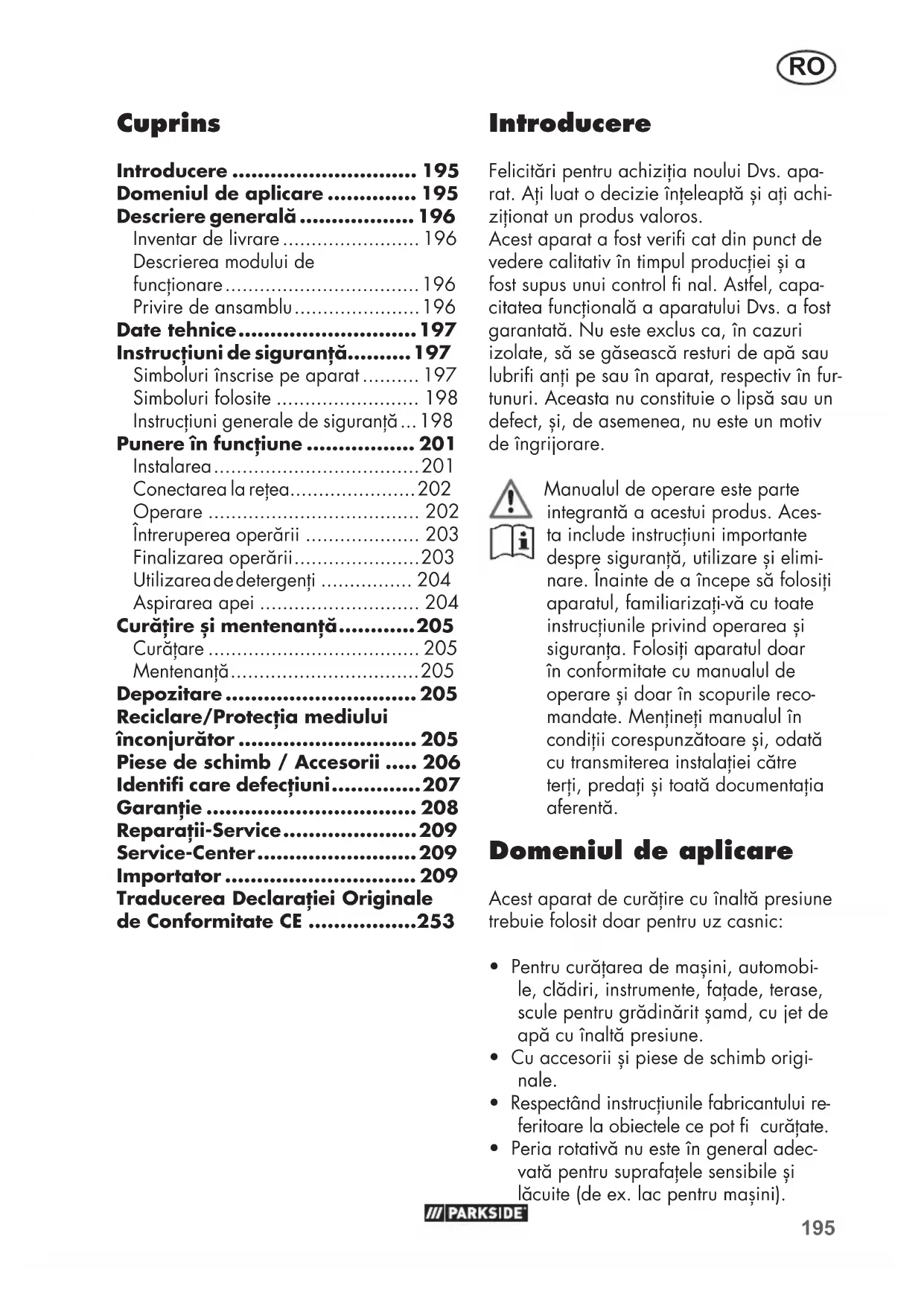 - Peria rotativă nu este în general adec- vată pentru suprafaţele sensibile și lăcuite (de ex. lac pentru mașini). Cuprins Introducere ............................. 195 Domeniul de aplicare .............. 195 Descriere generală .................. 196 Inventar de livrare ........................ 196 Descrierea modului de funcţionare .................................. 196 Privire de ansamblu ...................... 196 Date tehnice ............................ 197 Instrucţiuni de siguranţă.......... 197 Simboluri înscrise pe aparat .......... 197 Simboluri folosite ......................... 198 Instrucţiuni generale de siguranţă ... 198 Punere în funcţiune ................. 201 Instalarea .................................... 201 Conectarea la reţea...................... 202 Operare ..................................... 202 Întreruperea operării .................... 203 Finalizarea operării ...................... 203 Utilizarea de detergenţi ................ 204 Aspirarea apei ............................ 204 Curăţire și mentenanţă ............ 205 Curăţare ..................................... 205 Mentenanţă ................................. 205 Depozitare .............................. 205 Reciclare/Protecţia mediului înconjurător ............................ 205 Piese de schimb / Accesorii ..... 206 Identifi care defecţiuni .............. 207 Garanţie ................................. 208 Reparaţii-Service ..................... 209 Service-Center ......................... 209 Importator .............................. 209 Traducerea Declaraţiei Originale de Conformitate CE .................253196