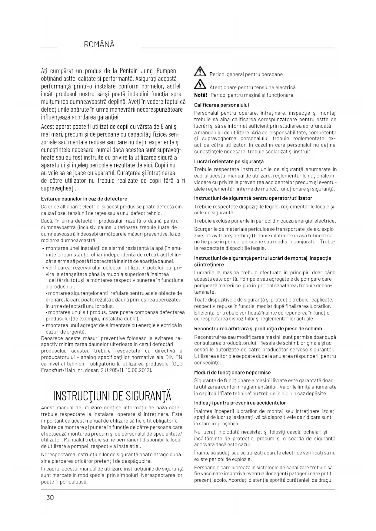 - A futókerék elkopott = a javítást a gyártó végezze 0197JUNG PUMPEN GmbH - Industriestr. 4-6 33803 Steinhagen, Germany 401.17-22.02EN 12050-2:2001; 2015Fekáliamentes szennyvizek átemelői DN 32 UV3 (JP50248)UV3 S (JP50249)UV3 S (JP50312)UV3 SF (JP50313)Fekáliamentes szennyvíz gyűjtése és emelése épü-leteken belül és kívül a visszatorlódási szint felettVISELKEDÉS TŰZ ESETÉN NPDVÍZÁLLÓSÁG MegfeleltHATÉKONYSÁG (EMELŐ HATÁS)- Szilárd anyagok szállítása Megfelelt- Csőcsatlakozások Megfelelt- Szellőzés NPD- Az áramlás minimális sebessége Megfelelt- A berendezés szabad, minimális áte-resztéseMegfelelt- Minimális hasznos volumen NPDMECHANIKAI SZILÁRDSÁG - A gyűjtőtartály terhelhetősége és strukturális stabilitása épületeken kívüli használathoz NPD - A gyűjtőtartály strukturális stabilitása épületeken belüli használathoz NPD ZAJSZINT 70 dB(A)TARTÓSSÁG- a strukturális stabilitás tartóssága NPD- az emelőhatás tartóssága Megfelelt- a mechanikai szilárdság tartóssága NPDVESZÉLYES ANYAGOK NPD30 ROMÂNĂ Aţi cumpărat un produs de la Pentair Jung Pumpen obţinând astfel calitate şi performanţă. Asiguraţi această performanţă printr-o instalare conform normelor, astfel încât produsul nostru să-şi poată îndeplini funcţia spre mulţumirea dumneavoastră deplină. Aveţi în vedere faptul că defecţiunile apărute în urma manevrării necorespunzătoare inuenţează acordarea garanţiei. Acest aparat poate utilizat de copii cu vârsta de 8 ani şi mai mari, precum şi de persoane cu capacităţi zice, sen- zoriale sau mentale reduse sau care nu deţin experienţa şi cunoştinţele necesare, numai dacă acestea sunt supraveg- heate sau au fost instruite cu privire la utilizarea sigură a aparatului şi înţeleg pericolele rezultate de aici. Copiii nu au voie să se joace cu aparatul. Curăţarea şi întreţinerea de către utilizator nu trebuie realizate de copii fără a supravegheaţi. Evitarea daunelor în caz de defectare Ca orice alt aparat electric, și acest produs se poate defecta din cauza lipsei tensiunii de rețea sau a unui defect tehnic. Dacă, în urma defectării produsului, rezultă o daună pentru dumneavoastră (inclusiv daune ulterioare), trebuie luate de dumneavoastră îndeosebi următoarele măsuri preventive, la ap- recierea dumneavoastră: