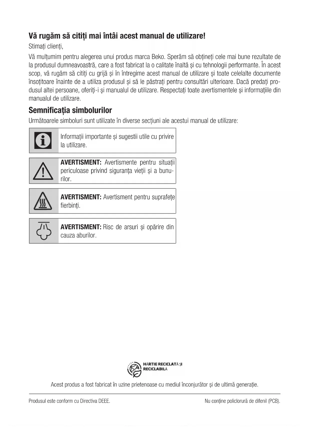 PRODUSUL NU BENEFICIAZĂ DE GARANŢIE LEGALĂ DE CONFORMITATE ÎN URMĂTOARELE CAZURI: - piesele şi accesoriile care prezintă lovituri, zgârieturi, spărturi sau deformări din vina exclusivă a consumatorului. Reclamaţiile referitoare la aspectele prevăzute mai jos, se rezolvă numai contra cost : Drepturile consumatorului sunt cele prevăzute în OUG nr. 140/2021 și OG 21/1992 (republicată). Pentru orice defecţiune aparută în perioada de garanţie legală, apelaţi la vânzător (respectiv, prin magazinul de unde a fost achiziţionat produsul sau direct prin Call Center Arctic). Prelungirea termenului de garanţie se va înscrie în certicatul de garanţie de către unitatea SERVICE care a efectuat reparaţia. Garanţia acoperă repararea şi/sau înlocuirea pieselor constatate ca neconforme în sensul OUG nr. 140/2021 (necauzate de consumator) de către tehnicienii Service Arctic. Termenul de realizare a operaţiilor de reparare, înlocuire sau întreţinere este de 15 zile calendaristice de la data la care cumpărătorul a sesizat lipsa de conformitate către vânzător (respectiv, prin magazinul de unde a achiziţionat produsul sau direct prin Call Center Arctic). Reparaţiile / înlocuirile se efectuează cu respectarea următoarelor condiţii - art. 12(1)-(5) din OUG nr. 140/2021: a) fără costuri și fără vreun inconvenient semnicativ pentru consumator, ţinând seama de natura bunurilor şi de scopul pentru care consumatorul a solicitat bunurile în cauză; b) consumatorul pune bunurile la dispoziţia vânzătorului, iar vânzătorul preia bunurile înlocuite pe propria cheltuială; c) obligaţia de a repara sau înlocui bunurile include, după caz, demontarea bunurilor neconforme şi instalarea bunurilor de înlocuire sau a bunurilor reparate sau suportarea costurilor aferente demontării şi instalării; d) consumatorul nu este obligat să plătească pentru utilizarea normală a bunurilor înlocuite în perioada care a precedat înlocuirea acestora. CONDIŢII SUPLIMENTARE DE GARANŢIE LEGALĂ DE CONFORMITATE: În cadrul acestui proces, Arctic vă prelucrează date cu caracter personal, cu respectarea legilor aplicabile privind condenţialitatea și protecţia datelor. Pentru informaţii complete despre modul în care vă prelucrăm datele, precum și despre drepturile dumneavoastră, vă rugăm să consultaţi secţiunea “Protecţia datelor personale”, accesând site-ul nostru la adresa https://www.beko.ro/.Si prega di leggere questo manuale prima dell’uso! Gentile Cliente, Grazie per aver scelto un prodotto Beko. Ci auguriamo che riesca ad ottenere i risultati migliori da questo prodotto, realizzato con tecnologia all’avanguardia e di alta qualità. Pertanto, prima di utilizzare il prodotto, La preghiamo di leggere con attenzione e per intero il presente manuale e ogni altro docu- mento allegato, conservandoli come riferimento per impieghi futuri. Nel caso cedesse il prodotto ad altre persone, consegni loro anche queste istruzioni. Segua tutte le avvertenze e le informazioni riportate nel manuale utente. Significato dei simboli I seguenti simboli sono utilizzati in diverse sezioni del presente manuale: