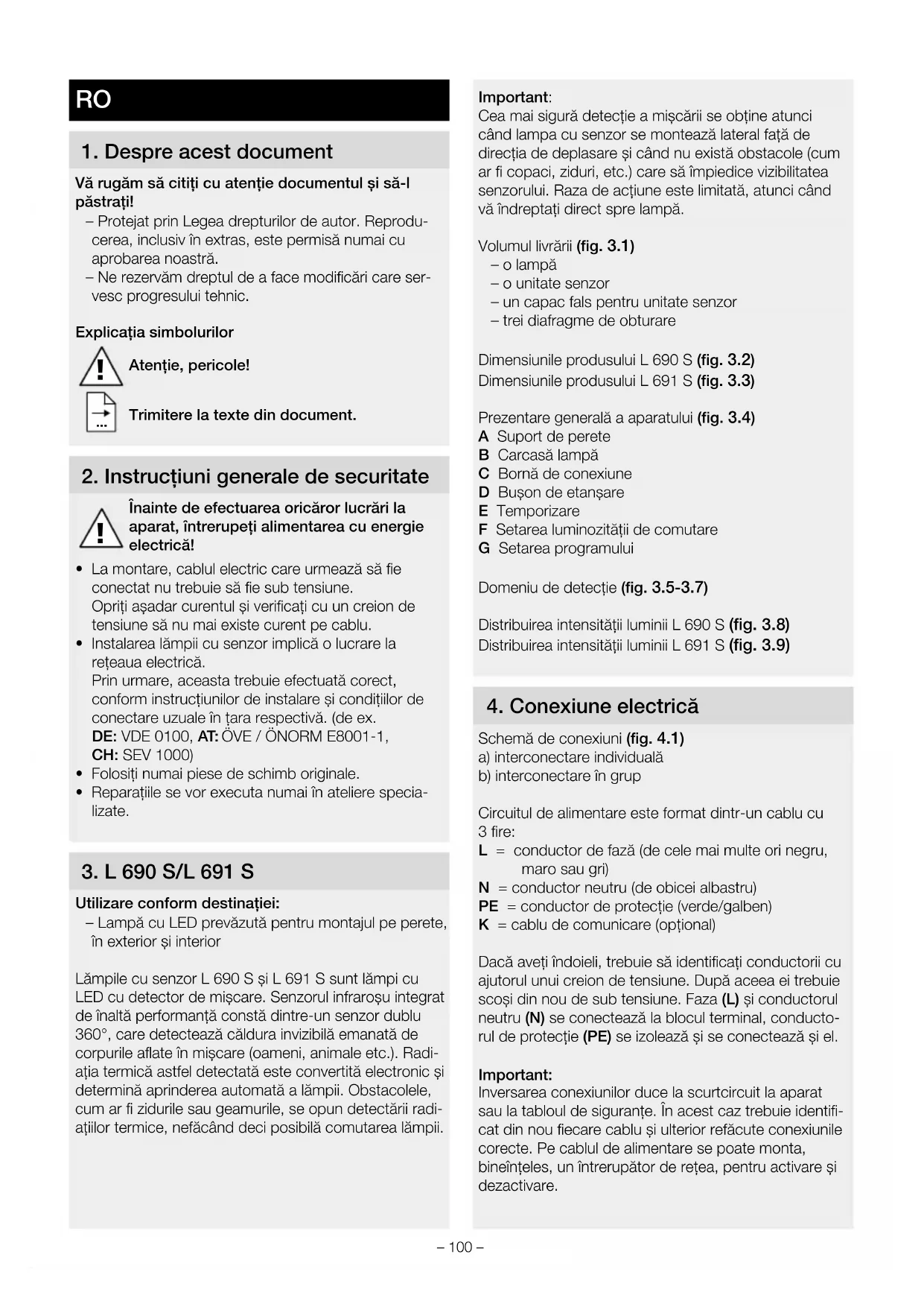 Utilizare conform destinaţiei: – Lampă cu LED prevăzută pentru montajul pe perete, în exterior şi interior Lămpile cu senzor L690 S şi L691 S sunt lămpi cu LED cu detector de mişcare. Senzorul infraroşu integrat de înaltă performanţă constă dintre-un senzor dublu 360°, care detectează căldura invizibilă emanată de corpurile aflate în mişcare (oameni, animale etc.). Radi- aţia termică astfel detectată este convertită electronic şi determină aprinderea automată a lămpii. Obstacolele, cum ar fi zidurile sau geamurile, se opun detectării radi- aţiilor termice, nefăcând deci posibilă comutarea lămpii. Important: Cea mai sigură detecţie a mişcării se obţine atunci când lampa cu senzor se montează lateral faţă de direcţia de deplasare şi când nu există obstacole (cum ar fi copaci, ziduri, etc.) care să împiedice vizibilitatea senzorului. Raza de acţiune este limitată, atunci când vă îndreptaţi direct spre lampă. Volumul livrării (fig.3.1) – o lampă – o unitate senzor – un capac fals pentru unitate senzor – trei diafragme de obturare Dimensiunile produsului L690 S (fig.3.2) Dimensiunile produsului L691 S (fig.3.3) Prezentare generală a aparatului (fig.3.4) A Suport de perete B Carcasă lampă C Bornă de conexiune D Buşon de etanşare E Temporizare F Setarea luminozităţii de comutare G Setarea programului Domeniu de detecţie (fig.3.5-3.7) Distribuirea intensităţii luminii L690S (fig.3.8) Distribuirea intensităţii luminii L691S (fig.3.9)