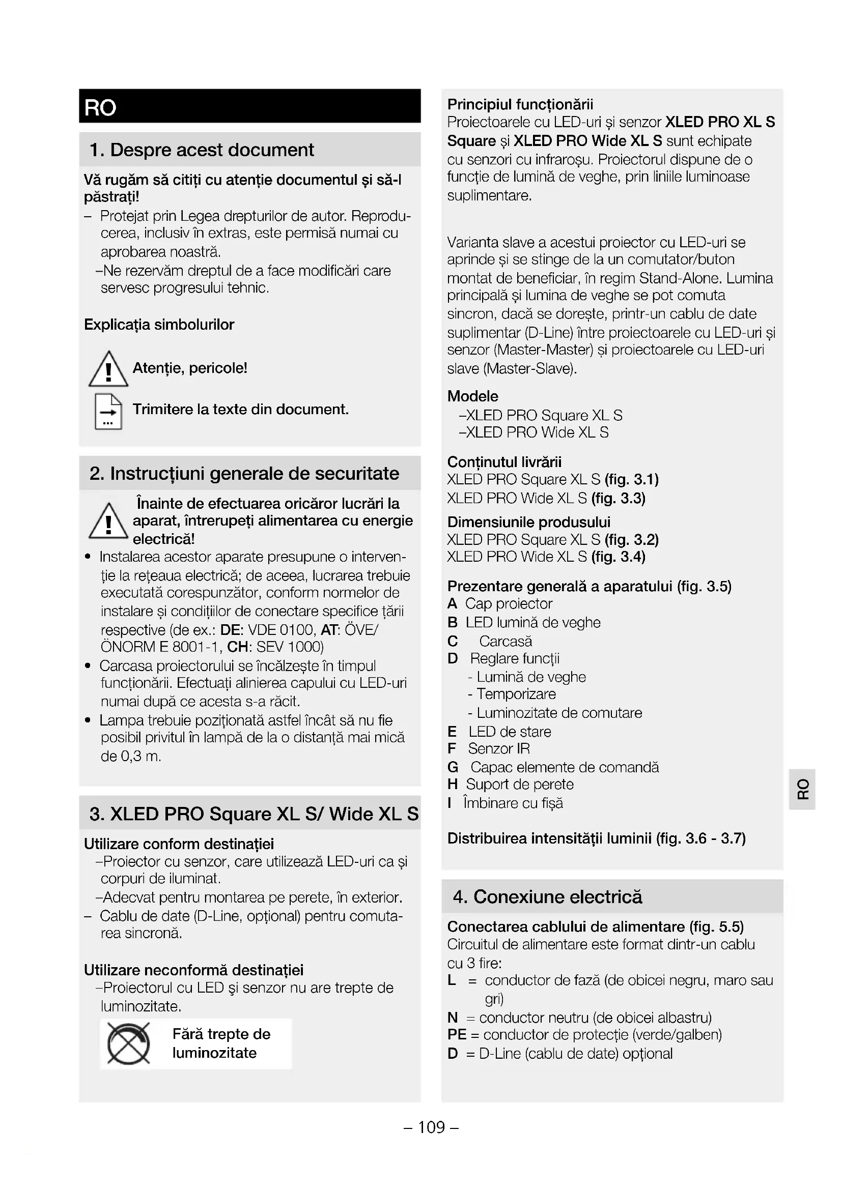 Utilizare conform destinaţiei – Proiector cu senzor, care utilizează LED-uri ca și corpuri de iluminat. – Adecvat pentru montarea pe perete, în exterior. – Cablu de date (D-Line, opţional) pentru comuta- rea sincronă. Utilizare neconformă destinaţiei – Proiectorul cu LED şi senzor nu are trepte de luminozitate. Fără trepte de luminozitate Principiul funcţionării Proiectoarele cu LED-uri și senzor XLEDPROXLS Square și XLEDPROWideXLS sunt echipate cu senzori cu infraroșu. Proiectorul dispune de o funcţie de lumină de veghe, prin liniile luminoase suplimentare. Varianta slave a acestui proiector cu LED-uri se aprinde și se stinge de la un comutator/buton montat de beneficiar, în regim Stand-Alone. Lumina principală și lumina de veghe se pot comuta sincron, dacă se dorește, printr-un cablu de date suplimentar (D-Line) între proiectoarele cu LED-uri și senzor (Master-Master) și proiectoarele cu LED-uri slave (Master-Slave). Modele – XLEDPROSquareXLS – XLEDPROWideXLS Conținutul livrării XLEDPROSquareXLS (fig. 3.1) XLEDPROWideXLS (fig. 3.3) Dimensiunile produsului XLEDPROSquareXLS (fig. 3.2) XLEDPROWideXLS (fig. 3.4) Prezentare generală a aparatului (fig. 3.5) A Cap proiector B LED lumină de veghe C Carcasă D Reglare funcţii - Lumină de veghe - Temporizare - Luminozitate de comutare E LED de stare F Senzor IR G Capac elemente de comandă H Suport de perete I Îmbinare cu fișă Distribuirea intensităţii luminii (fig. 3.6 - 3.7)