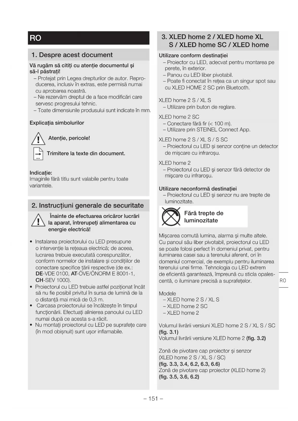 S/XLEDhome SC/XLEDhome Utilizare conform destinaţiei – Proiector cu LED, adecvat pentru montarea pe perete, în exterior. – Panou cu LED liber pivotabil. – Poate fi conectat în reea ca un singur spot sau cu XLED HOME 2 SC prin Bluetooth. XLEDhome2 S/XL S – Utilizare prin buton de reglare. XLEDhome2 SC – Conectare fără fir (<100m). – Utilizare prin STEINEL Connect App. XLED home 2 S/XL S/S SC – Proiectorul cu LED și senzor conţine un detector de mișcare cu infraroșu. XLED home 2 – Proiectorul cu LED şi senzor fără detector de mişcare cu infraroşu. Utilizare neconformă destinaţiei – Proiectorul cu LED şi senzor nu are trepte de luminozitate. Fără trepte de luminozitate Mișcarea comută lumina, alarma și multe altele. Cu panoul său liber pivotabil, proiectorul cu LED se poate folosi perfect în domeniul privat, pentru iluminarea casei sau a terenului aferent, ori în domeniul comercial, de exemplu pentru iluminarea terenului unei firme. Tehnologia cu LED extrem de eficientă garantează, împreună cu sticla opales- centă, o iluminare precisă a suprafeţelor. Modele – XLEDhome2 S/XL S – XLEDhome2SC – XLEDhome2 Volumul livrării versiuni XLED home 2 S/XL S/SC (fig.3.1) Volumul livrării versiune XLEDhome2 (fig.3.2) Zonă de pivotare cap proiector și senzor (XLED home 2 S/XL S/SC) (fig.3.3, 3.4, 6.2, 6.3, 6.6) Zonă de pivotare cap proiector (XLEDhome2) (fig.3.5, 3.6, 6.2) RO– 152 – Dimensiunile produsului (XLED home 2 S/XL S/SC) (fig.3.7, 3.8) Dimensiunile produsului (XLEDhome2) (fig.3.9, 3.10) Prezentare generală a aparatului (XLED home 2 S/XL S/SC) (fig.3.11) A Panou cu LED B Carcasă C Suport de perete D Unitate senzor E Temporizare (XLED home 2 S/XLED home2XL S) F Setarea luminozităţii de comutare (XLED home 2 S/XLEDhome 2 XL S) Prezentare generală a aparatului (XLEDhome2) (fig.3.12) A Panou cu LED B Carcasă C Suport de perete Distribuirea intensităţii luminii (fig. 3.13)