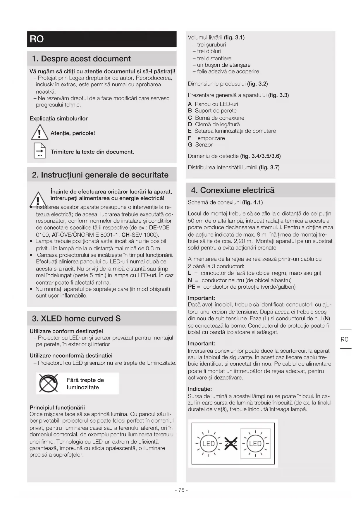 Atenţie, pericole! Trimitere la texte din document 2 Instrucţiuni generale de securitate Înainte de efectuarea oricăror lucrări la aparat, întrerupeţi alimentarea cu energie electrică! • Instalarea acestor aparate presupune o intervenţie la re-ţeaua electrică; de aceea, lucrarea trebuie executată co-respunzător, conform normelor de instalare şi condiţiilor de conectare specifice ţării respective (de ex.: DE-VDE 0100, AT-ÖVE/ÖNORM E 8001-1, CH-SEV 1000).• Lampa trebuie poziţionată astfel încât să nu fie posibil privitul în lampă de la o distanţă mai mică de 0,3m.• Carcasa proiectorului se încălzeşte în timpul funcţionării. Efectuaţi alinierea panoului cu LED-uri numai după ce acesta s-a răcit. Nu priviţi de la mică distanţă sau timp mai îndelungat (peste 5 min.) în lampa cu LED-uri. În caz contrar poate fi afectată retina.• Nu montaţi aparatul pe suprafeţe care (în mod obişnuit) sunt uşor inflamabile. 3 XLED home curved S Utilizare conform destinaţiei – Proiector cu LED-uri şi senzor prevăzut pentru montajul pe perete, în exterior şi interiorUtilizare neconformă destinaţiei – Proiectorul cu LED şi senzor nu are trepte de luminozitate.Fără trepte de luminozitatePrincipiul funcţionăriiOrice mişcare face să se aprindă lumina. Cu panoul său li-ber pivotabil, proiectorul se poate folosi perfect în domeniul privat, pentru iluminarea casei sau a terenului aferent, ori în domeniul comercial, de exemplu pentru iluminarea terenului unei firme. Tehnologia cu LED-uri extrem de eficientă garantează, împreună cu sticla opalescentă, o iluminare precisă a suprafeţelor.