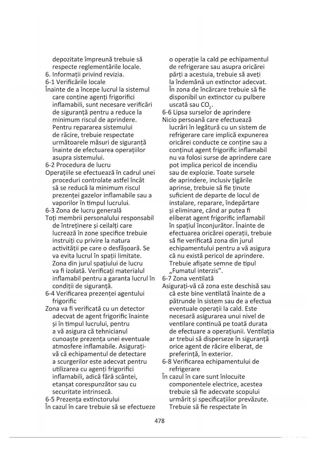6-1 Vericările locale Înainte de a începe lucrul la sistemul care conţine agenţi frigorici inamabili, sunt necesare vericări de siguranţă pentru a reduce la minimum riscul de aprindere. Pentru repararea sistemului de răcire, trebuie respectate următoarele măsuri de siguranţă înainte de efectuarea operaţiilor asupra sistemului. 6-2 Procedura de lucru Operaţiile se efectuează în cadrul unei proceduri controlate asel încât să se reducă la minimum riscul prezenţei gazelor inamabile sau a vaporilor în mpul lucrului. 6-3 Zona de lucru generală Toţi membrii personalului responsabil de întreţinere şi ceilalţi care lucrează în zone specice trebuie instruiţi cu privire la natura acvităţii pe care o desfăşoară. Se va evita lucrul în spaţii limitate. Zona din jurul spaţiului de lucru va izolată. Vericaţi materialul inamabil pentru a garanta lucrul în condiţii de siguranţă. 6-4 Vericarea prezenţei agentului frigoric Zona va vericată cu un detector adecvat de agent frigoric înainte şi în mpul lucrului, pentru a vă asigura că tehnicianul cunoaşte prezenţa unei eventuale atmosfere inamabile. Asiguraţi- vă că echipamentul de detectare a scurgerilor este adecvat pentru ulizarea cu agenţi frigorici inamabili, adică fără scântei, etanşat corespunzător sau cu securitate intrinsecă. 6-5 Prezenţa exnctorului În cazul în care trebuie să se efectueze o operaţie la cald pe echipamentul de refrigerare sau asupra oricărei părţi a acestuia, trebuie să aveţi la îndemână un exnctor adecvat. În zona de încărcare trebuie să e disponibil un exnctor cu pulbere uscată sau CO