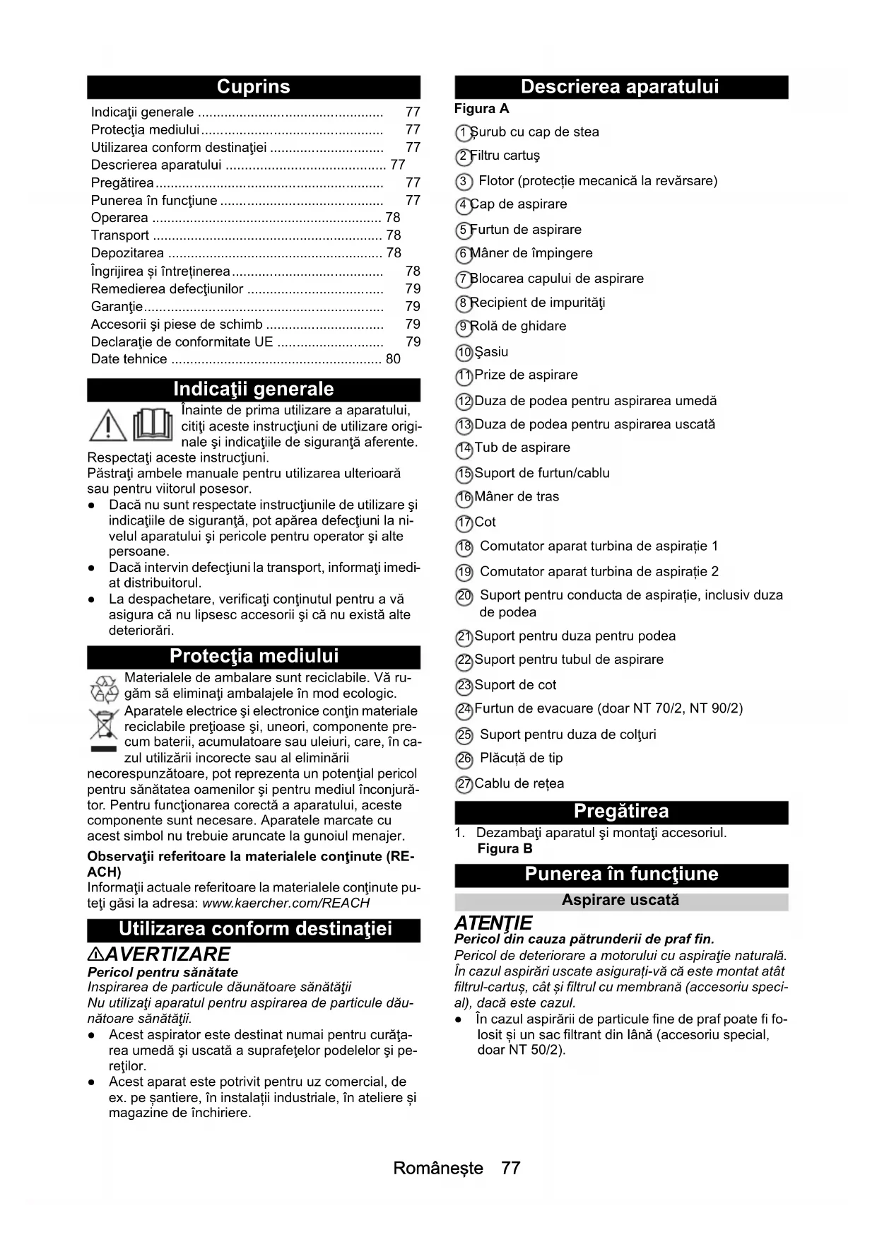 H05VV-F 2x1,0 H05VV-F 2x1,0 H05VV-F 2x1,0 Numer części (EU) 9.770-933.0 9.770-933.0 9.770-933.0 Długość kabla m 7,5 7,5 7,5Româneşte 77 Cuprins Indicaţii generale Înainte de prima utilizare a aparatului, citiţi aceste instrucţiuni de utilizare origi- nale şi indicaţiile de siguranţă aferente. Respectaţi aceste instrucţiuni. Păstraţi ambele manuale pentru utilizarea ulterioară sau pentru viitorul posesor. ● Dacă nu sunt respectate instrucţiunile de utilizare şi indicaţiile de siguranţă, pot apărea defecţiuni la ni- velul aparatului şi pericole pentru operator şi alte persoane. ● Dacă intervin defecţiuni la transport, informaţi imedi- at distribuitorul. ● La despachetare, verificaţi conţinutul pentru a vă asigura că nu lipsesc accesorii şi că nu există alte deteriorări. Protecţia mediului Materialele de ambalare sunt reciclabile. Vă ru- găm să eliminaţi ambalajele în mod ecologic. Aparatele electrice şi electronice conţin materiale reciclabile preţioase şi, uneori, componente pre- cum baterii, acumulatoare sau uleiuri, care, în ca- zul utilizării incorecte sau al eliminării necorespunzătoare, pot reprezenta un potenţial pericol pentru sănătatea oamenilor şi pentru mediul înconjură- tor. Pentru funcţionarea corectă a aparatului, aceste componente sunt necesare. Aparatele marcate cu acest simbol nu trebuie aruncate la gunoiul menajer. Observaţii referitoare la materialele conţinute (RE- ACH) Informaţii actuale referitoare la materialele conţinute pu- teţi găsi la adresa: www.kaercher.com/REACH Utilizarea conform destinaţiei 몇 AVERTIZARE Pericol pentru sănătate Inspirarea de particule dăunătoare sănătăţii Nu utilizaţi aparatul pentru aspirarea de particule dău- nătoare sănătăţii. ● Acest aspirator este destinat numai pentru curăţa- rea umedă şi uscată a suprafeţelor podelelor şi pe- reţilor. ● Acest aparat este potrivit pentru uz comercial, de ex. pe șantiere, în instalații industriale, în ateliere și magazine de închiriere. Descrierea aparatului Figura A 1 Șurub cu cap de stea 2 Filtru cartuş 3 Flotor (protecție mecanică la revărsare) 4 Cap de aspirare 5 Furtun de aspirare 6 Mâner de împingere 7 Blocarea capului de aspirare 8 Recipient de impurităţi 9 Rolă de ghidare 10 Şasiu 11 Prize de aspirare 12 Duza de podea pentru aspirarea umedă 13 Duza de podea pentru aspirarea uscată 14 Tub de aspirare 15 Suport de furtun/cablu 16 Mâner de tras 17 Cot 18 Comutator aparat turbina de aspirație 1 19 Comutator aparat turbina de aspirație 2 20 Suport pentru conducta de aspirație, inclusiv duza de podea 21 Suport pentru duza pentru podea 22 Suport pentru tubul de aspirare 23 Suport de cot 24 Furtun de evacuare (doar NT 70/2, NT 90/2) 25 Suport pentru duza de colţuri 26 Plăcuță de tip 27 Cablu de rețea Pregătirea