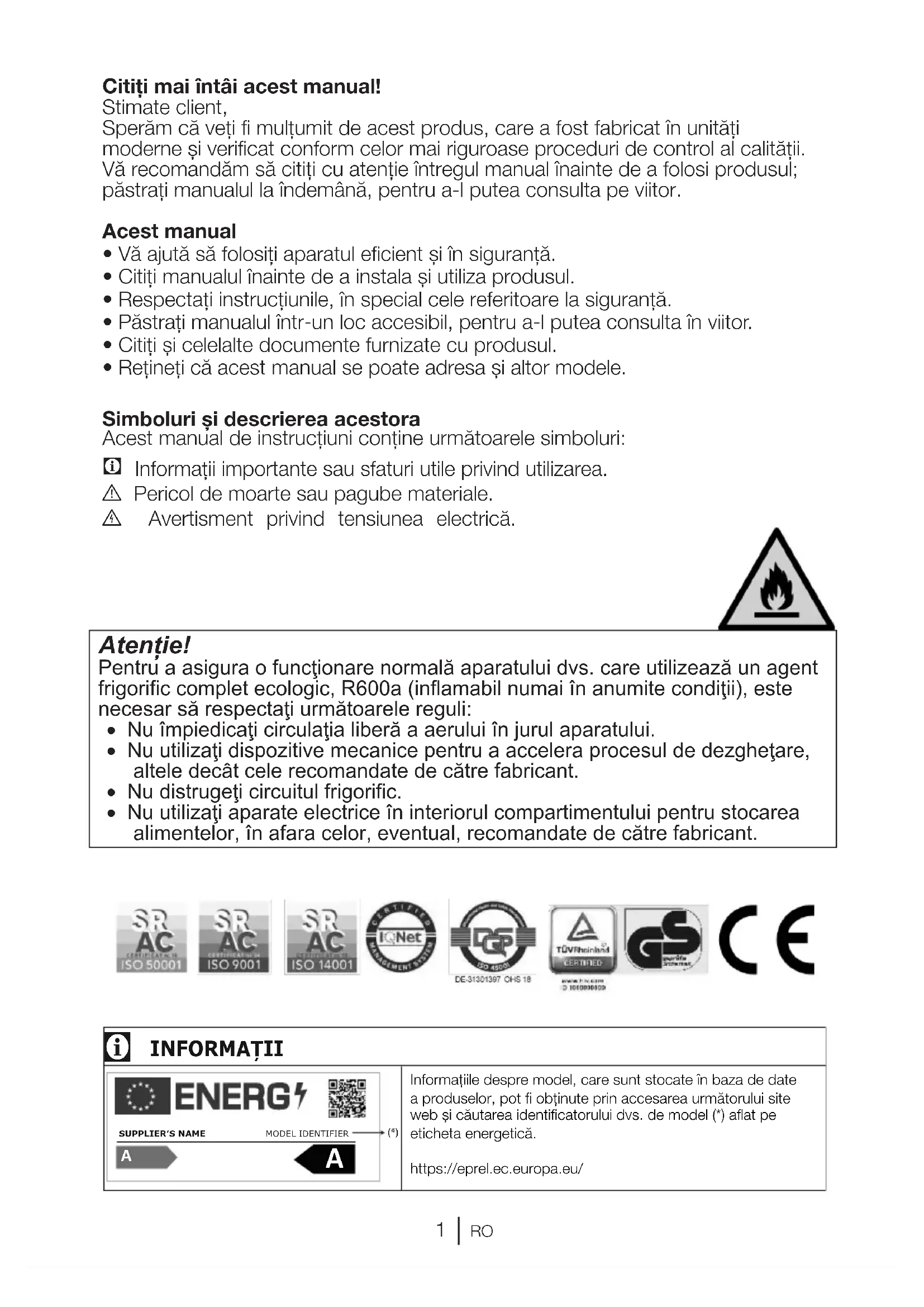 - Citiţi şi celelalte documente furnizate cu produsul.• Reţineţi că acest manual se poate adresa şi altor modele.Simboluri şi descrierea acestoraAcest manual de instrucţiuni conţine următoarele simboluri: Informaţii importante sau sfaturi utile privind utilizarea. A Pericol de moarte sau pagube materiale. B Avertisment privind tensiunea electrică. Atenţie! Pentru a asigura o funcţionare normală aparatului dvs. care utilizează un agent frigorific complet ecologic, R600a (inflamabil numai în anumite condiţii), este necesar să respectaţi următoarele reguli:• Nu împiedicaţi circulaţia liberă a aerului în jurul aparatului.• Nu utilizaţi dispozitive mecanice pentru a accelera procesul de dezgheţare,altele decât cele recomandate de către fabricant.• Nu distrugeţi circuitul frigorific.• Nu utilizaţi aparate electrice în interiorul compartimentului pentru stocareaalimentelor, în afara celor, eventual, recomandate de către fabricant.