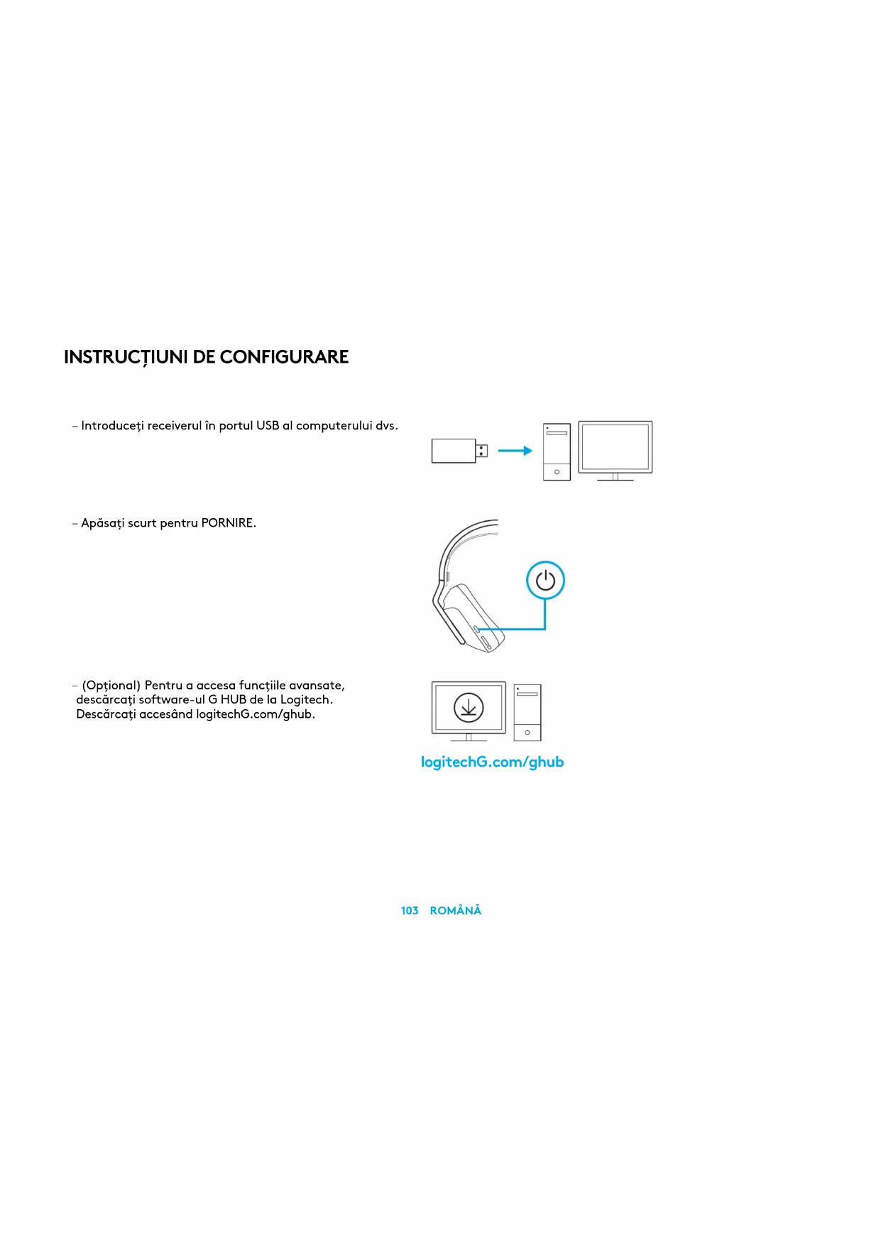 – Introducei receiverul în portul USB al computerului dvs. – Apăsai scurt pentru PORNIRE. – (Opional) Pentru a accesa funciile avansate, descărcaisoftware-ul G HUB de la Logitech. Descărcaiaccesând logitechG.com/ghub. logitechG.com/ghub104 ROMÂNĂ – Suporturile de căști din jurul urechii pot reglate însusșiînjos. – Lungimea benzii poate reglată.105 ROMÂNĂ – Rotii în sus braul microfonului pentru a dezactiva sunetul. – Încărcaţi căştile când nivelul bateriei este scăzut.106 ROMÂNĂ CARACTERISTICI 1 Bandă ajustabilă de suspensie, reversibilă 2 Suporturi de urechi din spumă cu memorie 3 Difuzoare de 40 mm 4 Control volum de pe cască 5 Microfon de 6 mm, ce poate rotit pentru a-l dezactiva 6 Port de încărcare USB-C