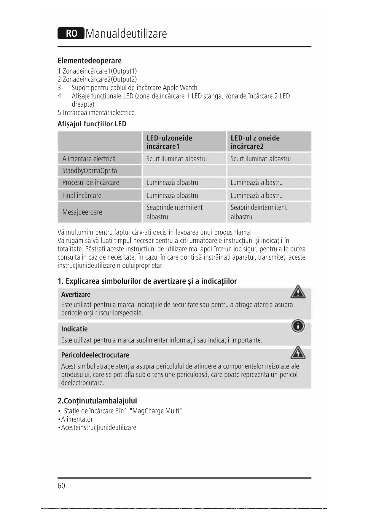 Așajul funcțiilorLED LED-ul zoneide încărcare 1 LED-ulzoneide încărcare2 Alimentareelectrică Scurt iluminat albastru Scurt iluminat albastru Standby Oprită Oprită Procesul de încărcareLuminează albastru Luminează albastru Final încărcareLuminează albastru Luminează albastru Mesaj de eroare Se aprinde intermitent albastru Se aprinde intermitent albastru Vă mulțumim pentru faptul că v-ațidecis înfavoarea unui produs Hama! Vă rugămsăvăluațitimpul necesar pentru aciti următoarele instrucțiuni șiindicații în totalitate. Păstrațiaceste instrucțiuni de utilizaremai apoi într-un loc sigur,pentru aleputea consulta încaz de necesitate. Încazul încaredorițisăînstrăinațiaparatul, transmitețiaceste instrucțiuni de utilizarenoului proprietar.