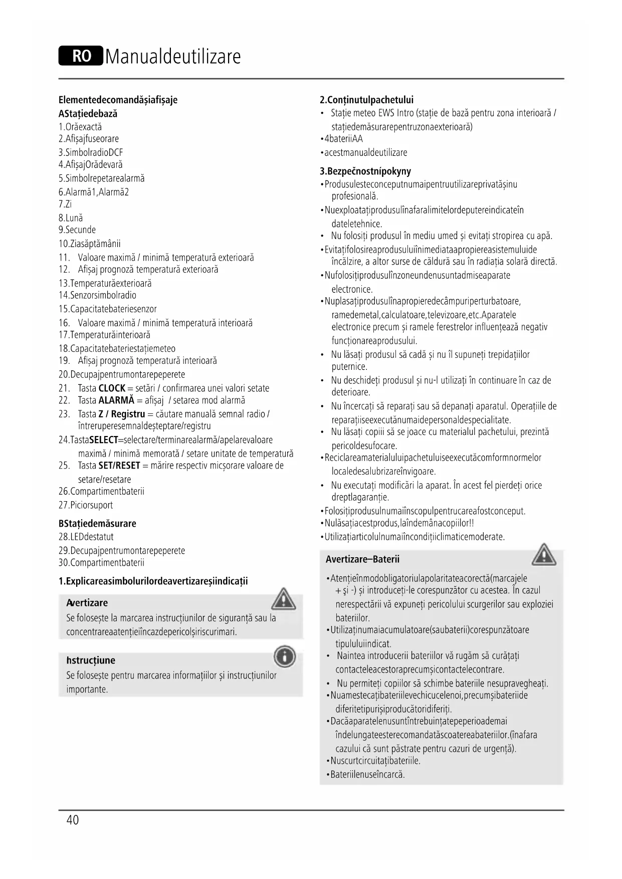 - Utilizați articolul numai în condiții climatice moderate. Avertizare – Baterii