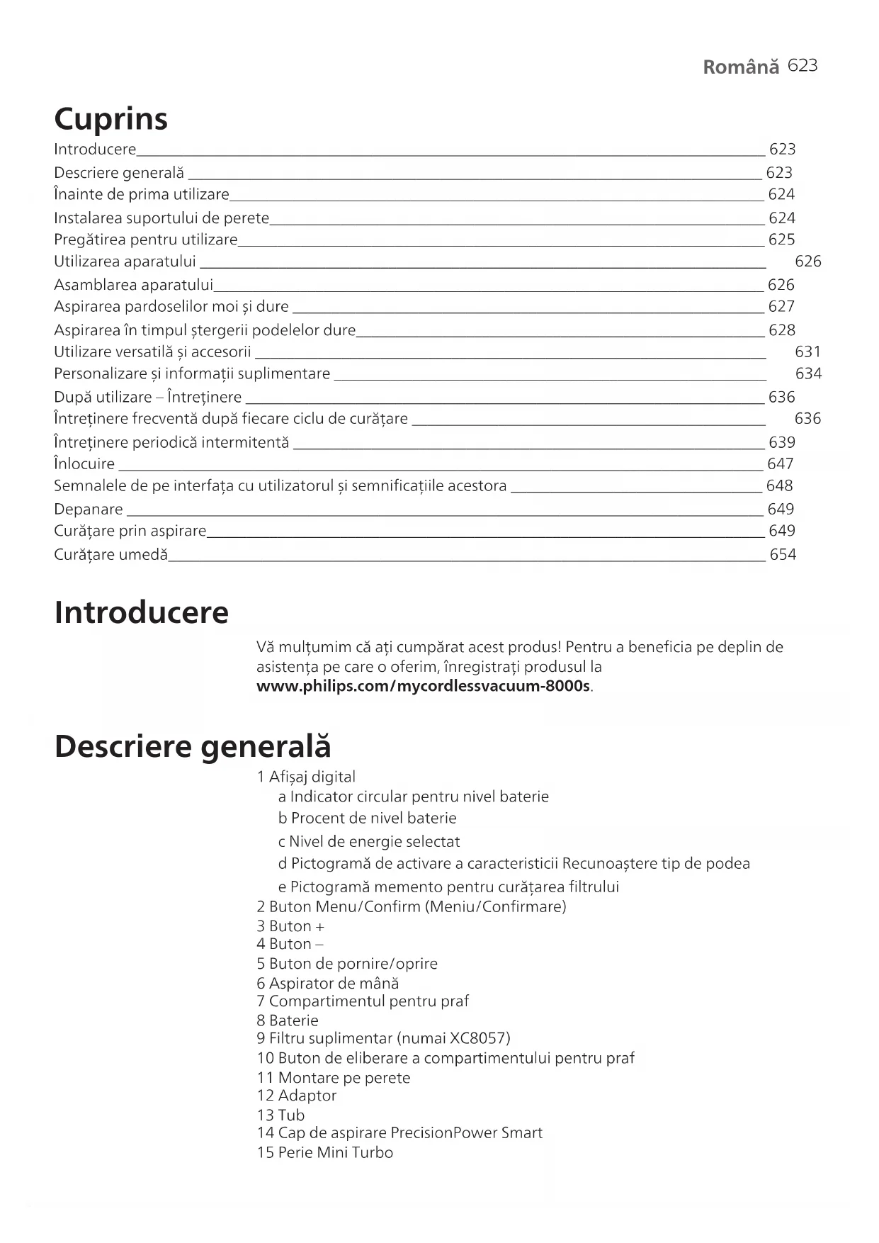 Română Cuprins Introducere________________________________________________________________________________ 623 Descriere generală _________________________________________________________________________ 623 Înainte de prima utilizare____________________________________________________________________ 624 Instalarea suportului de perete_______________________________________________________________ 624 Pregătirea pentru utilizare___________________________________________________________________ 625 Utilizarea aparatului ________________________________________________________________________ 626 Asamblarea aparatului______________________________________________________________________ 626 Aspirarea pardoselilor moi și dure ____________________________________________________________ 627 Aspirarea în timpul ștergerii podelelor dure____________________________________________________ 628 Utilizare versatilă și accesorii _________________________________________________________________ 631 Personalizare și informații suplimentare _______________________________________________________ 634 După utilizare – Întreținere __________________________________________________________________ 636 Întreținere frecventă după fiecare ciclu de curățare _____________________________________________ 636 Întreținere periodică intermitentă ____________________________________________________________ 639 Înlocuire __________________________________________________________________________________ 647 Semnalele de pe interfața cu utilizatorul și semnificațiile acestora ________________________________ 648 Depanare _________________________________________________________________________________ 649 Curățare prin aspirare_______________________________________________________________________ 649 Curățare umedă____________________________________________________________________________ 654 Introducere Vă mulțumim că ați cumpărat acest produs! Pentru a beneficia pe deplin de asistența pe care o oferim, înregistrați produsul la www.philips.com/mycordlessvacuum-8000s. Descriere generală 1 Afișaj digital a Indicator circular pentru nivel baterie b Procent de nivel baterie c Nivel de energie selectat d Pictogramă de activare a caracteristicii Recunoaștere tip de podea e Pictogramă memento pentru curățarea filtrului 2 Buton Menu/Confirm (Meniu/Confirmare) 3 Buton + 4 Buton – 5 Buton de pornire/oprire 6 Aspirator de mână 7 Compartimentul pentru praf 8 Baterie 9 Filtru suplimentar (numai XC8057) 10 Buton de eliberare a compartimentului pentru praf 11 Montare pe perete 12 Adaptor 13 Tub 14 Cap de aspirare PrecisionPower Smart 15 Perie Mini Turbo624 Română 16 Accesoriu mixt 17 Perie moale 18 Accesoriu pentru tapițerie 19 Accesoriu pentru spații înguste 20 Cap pentru aspirare și spălare 21 Rezervor de apă 22 Lavetă din microfibră Înainte de prima utilizare Instalarea suportului de perete 1 Întoarceți suportul de perete invers și decuplați maneta gri. Introduceți portul de încărcare, asigurându-vă că partea metalică este vizibilă și că este îndreptată în sus pe partea din față a suportului de perete. 2 Aranjați cablul, introducându-l în fanta specială. 3 Închideți maneta gri. Asigurați-vă că maneta gri este în poziție și se aude sunetul „CLIC”. 110 ± 2 cm 4 Fixați bine suportul de perete în poziția preferată, asigurându-vă că găurile pentru șuruburi de montaj se află la aproximativ 110 cm față de podea. Atenție: Procedați cu atenție atunci când dați găuri în perete pentru fixarea suportului de perete, pentru a evita riscul de electrocutare.625 Română Notă: Verificați dacă poziția suportului de perete permite fixarea aparatului la perete fără să intre capul de aspirare în contact cu podeaua. 5 După ce identificați poziția și înălțimea optime pentru depozitarea și încărcarea aparatului, strângeți bine șuruburile pentru a fixa suportul de perete. Pregătirea pentru utilizare Aparatul este echipat cu o baterie Li-Ion. După descărcare completă, durează aproape 6 ore ca aparatul să se încarce. 1 Atașați setul de baterii la corpul principal al aparatului, asigurându-vă că se aude sunetul „CLIC” care confirmă fixarea. MAX 40⁰C MIN 5⁰C 2 Așezați aparatul pe suportul de perete asamblat pentru a-l încărca. Avertisment: Depozitați și încărcați aparatul la o temperatură cuprinsă între 5°C și 40°C.626 Română Notă: De asemenea, puteți așeza aspiratorul de mână pe o suprafață dreaptă și stabilă și să îl conectați la cablul de încărcare.
