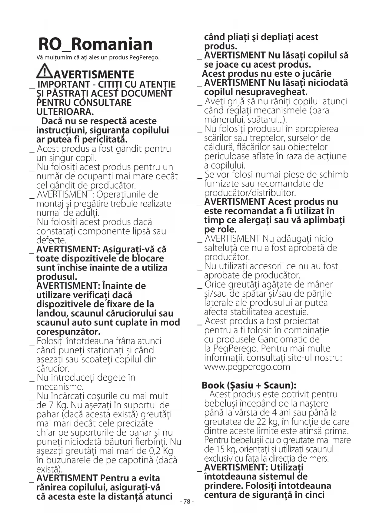 PENTRU CONSULTARE ULTERIOARA. Dacă nu se respectă aceste instrucţiuni, siguranţa copilului ar putea fi periclitată. _ Acest produs a fost gândit pentru un singur copil. _ Nu folosiţi acest produs pentru un număr de ocupanţi mai mare decât cel gândit de producător. _ AVERTISMENT: Operaţiunile de montaj şi pregătire trebuie realizate numai de adulţi. _ Nu folosiţi acest produs dacă constatați componente lipsă sau defecte. _ AVERTISMENT: Asiguraţi-vă că toate dispozitivele de blocare sunt închise înainte de a utiliza produsul. _ AVERTISMENT: Înainte de utilizare verificaţi dacă dispozitivele de fixare de la landou, scaunul căruciorului sau scaunul auto sunt cuplate în mod corespunzător. _ Folosiţi întotdeauna frâna atunci când puneţi staționați și când așezați sau scoateţi copilul din cărucior. _ Nu introduceţi degete în mecanisme. _ Nu încărcaţi coşurile cu mai mult de 7 Kg. Nu aşezaţi în suportul de pahar (dacă acesta există) greutăţi mai mari decât cele precizate chiar pe suporturile de pahar şi nu puneţi niciodată băuturi fierbinţi. Nu aşezaţi greutăţi mai mari de 0,2 Kg în buzunarele de pe capotină (dacă există). _ AVERTISMENT Pentru a evita rănirea copilului, asiguraţi-vă că acesta este la distanţă atunci când pliaţi şi depliaţi acest produs. _ AVERTISMENT Nu lăsați copilul să se joace cu acest produs. Acest produs nu este o jucărie _ AVERTISMENT Nu lăsaţi niciodată copilul nesupravegheat. _ Aveţi grijă să nu răniţi copilul atunci când reglaţi mecanismele (bara mânerului, spătarul...). _ Nu folosiţi produsul în apropierea scărilor sau treptelor, surselor de căldură, flăcărilor sau obiectelor periculoase aflate în raza de acţiune a copilului. _ Se vor folosi numai piese de schimb furnizate sau recomandate de producător/distribuitor. _ AVERTISMENT Acest produs nu este recomandat a fi utilizat în timp ce alergaţi sau vă aplimbaţi pe role. _ AVERTISMENT Nu adăugaţi nicio salteluţă ce nu a fost aprobată de producător. _ Nu utilizați accesorii ce nu au fost aprobate de producător. _ Orice greutăţi agăţate de mâner și/sau de spătar și/sau de părțile laterale ale produsului ar putea afecta stabilitatea acestuia. _ Acest produs a fost proiectat pentru a fi folosit în combinaţie cu produsele Ganciomatic de la PegPerego. Pentru mai multe informații, consultați site-ul nostru: www.pegperego.com Book (Șasiu + Scaun): Acest produs este potrivit pentru bebeluși începând de la naştere până la vârsta de 4 ani sau până la greutatea de 22 kg, în funcție de care dintre aceste limite este atinsă prima. Pentru bebelușii cu o greutate mai mare de 15 kg, orientați și utilizați scaunul exclusiv cu fața la direcția de mers. _ AVERTISMENT: Utilizaţi întotdeauna sistemul de prindere. Folosiţi întotdeauna centura de siguranţă în cinci- 79 - puncte. Fixați întotdeauna centura din talie de centura dintre picioare. _ Bara frontală nu a fost proiectată pentru a susţine greutatea copilului; bara frontală nu a fost proiectată pentru a ridica scaunul împreună cu greutatea copilului. Bara frontală nu înlocuieşte centura scaunului. _ Pentru bebeluşii nou-născuţi se recomandă folosirea spătarului în cea mai joasă poziţie. _ AVERTISMENT: nu folosiţi husa de ploaie (dacă există) în spaţii închise şi verificaţi cu regularitate dacă copilului nu îi este prea cald; nu lăsați căruciorul în apropierea surselor de căldură şi mențineți distanţa faţă de ţigări aprinse. Husa de ploaie nu trebuie folosită pe un cărucior fără capotină sau parasolar de care să se poată prinde. Folosiţi husa de ploaie numai sub supravegherea unui adult. Asiguraţi-vă că husa de ploaie nu obstrucţionează niciun mecanism în mişcare al șasiului sau al căruciorului. Scoateţi întotdeauna husa de ploaie înainte de a plia şasiul sau căruciorul. Șasiul + Scaunul auto Book: este aprobat pentru copii de la naștere până la greutatea de 13 kg. Atunci când este folosit în combinaţie cu scaunul auto, acest produs nu înlocuieşte pătuţul sau patul. În cazul în care copilul vrea să doarmă el trebuie aşezat într-un landou, pătuţ sau pat potrivit. Șasiul + Landoul Book: este aprobat pentru copii de la naștere până la greutatea de 9 kg. Atunci când este folosit în combinaţie cu landoul: acest produs este potrivit pentru un copil care nu poate sta singur în şezut, nu se poate rostogoli şi nu se poate împinge în sus sprijinindu- se în mâini şi genunchi. Greutatea maximă a copilului: 9 kg. Mânerul de transport (dacă există) trebuie lăsat în afara landoului, în așa fel încât copilul să nu ajungă la el în timpul utilizării acestuia. Imaginile care fac referire la detaliile textilelor pot conține diferențe față de colecția achiziționată. Pentru mai multe informații, consultați site-ul nostru: www.pegperego.com INSTRUCȚIUNI ȘASIUL BOOK 1 DEPLIEREA: Înainte de a deplia cadrul, îndepărtaţi toate separatoarele din carton (fără a folosi lame). AVERTISMENT: _ NU TRAGEŢI ŞI NU FORŢAŢI ELEMENTUL DE PRINDERE PESTE LIMITĂ. _ NU FOLOSIŢI CÂRLIGUL DE BLOCARE CA AGĂŢĂTOARE PENTRU GREUTĂŢI. NU AGĂŢAŢI SACOŞE SAU ALTE ACCESORII DE ACEST ELEMENT. Apăsaţi în jos elementul de fixare lateral, apucaţi cu mâna secţiunea superioară a mânerului şi rotiţi-l către dumneavoastră până când cadrul este complet depliat(fig._a). Depliaţi cadrul (fig_b). Cadrul este corect depliat atunci când auziţi un click de la dispozitivul de prindere de la baza lui, aşa cum se arată în figură. AVERTISMENT: Când aşezaţi scaunul pe cadru, apăsaţi scaunul în jos pentru a vă asigura că se fixează bine pe bază. 2 MONTAJUL ROŢ ILOR: Introduceţi axele verticale în orificiul destinat roţilor din spate (fig_a), având grijă să fie aşezate cu faţa în direcţia corectă, apoi împingeţi roţi