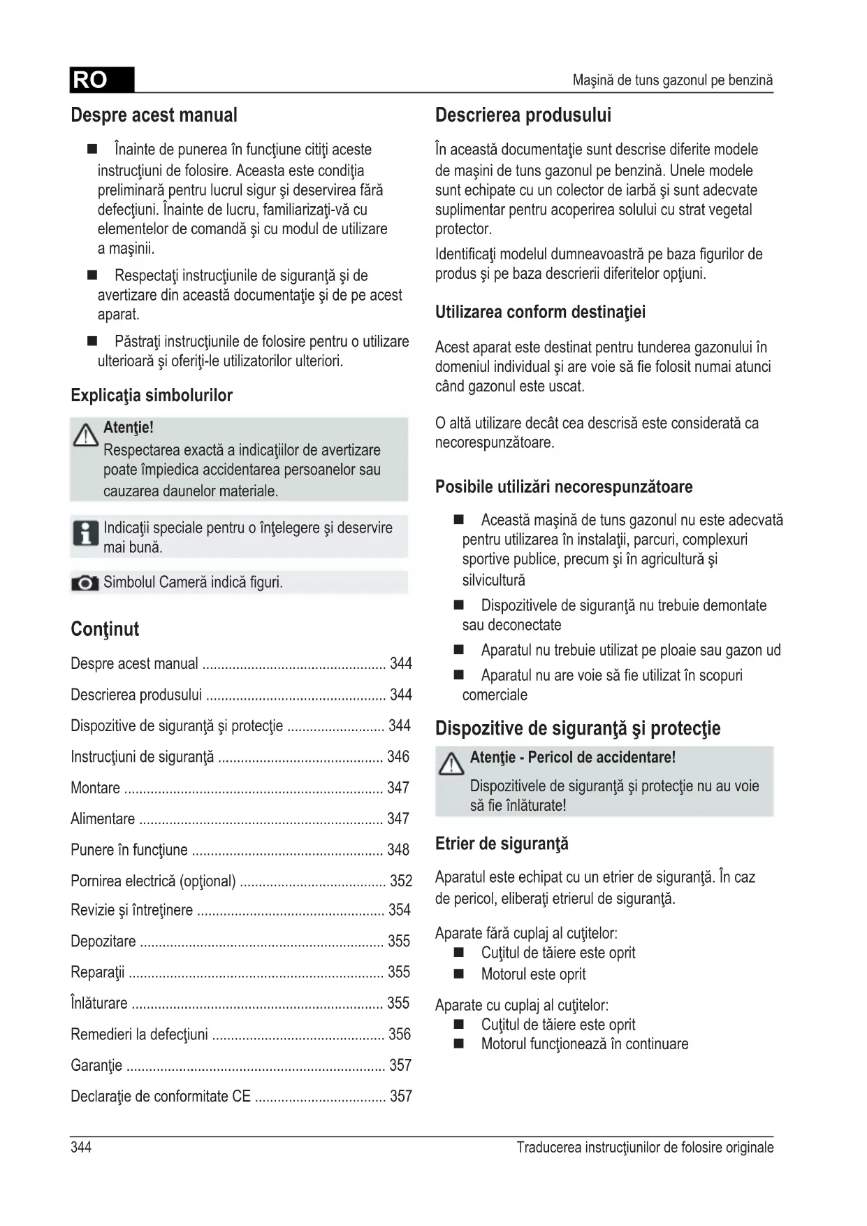 - Declaraţie de conformitate CE Despre acest manual Înainte de punerea în funcţiune citiţi aceste instrucţiuni de folosire. Aceasta este condiţia preliminară pentru lucrul sigur şi deservirea fără defecţiuni. Înainte de lucru, familiarizaţi-vă cu elementelor de comandă şi cu modul de utilizare a maşinii. Respectaţi instrucţiunile de siguranţă şi de avertizare din această documentaţie şi de pe acest aparat. Păstraţi instrucţiunile de folosire pentru o utilizare ulterioară şi oferiţi-le utilizatorilor ulteriori. Explicaţia simbolurilor Atenţie! Respectarea exactă a indicaţiilor de avertizare poate împiedica accidentarea persoanelor sau cauzarea daunelor materiale. Indicaţii speciale pentru o înţelegere şi deservire mai bună. Simbolul Cameră indică guri. Descrierea produsului În această documentaţie sunt descrise diferite modele de maşini de tuns gazonul pe benzină. Unele modele sunt echipate cu un colector de iarbă şi sunt adecvate suplimentar pentru acoperirea solului cu strat vegetal protector. Identicaţi modelul dumneavoastră pe baza gurilor de produs şi pe baza descrierii diferitelor opţiuni. Utilizarea conform destinaţiei Acest aparat este destinat pentru tunderea gazonului în domeniul individual şi are voie să e folosit numai atunci când gazonul este uscat. O altă utilizare decât cea descrisă este considerată ca necorespunzătoare. Posibile utilizări necorespunzătoare Această maşină de tuns gazonul nu este adecvată pentru utilizarea în instalaţii, parcuri, complexuri sportive publice, precum şi în agricultură şi silvicultură Dispozitivele de siguranţă nu trebuie demontate sau deconectate Aparatul nu trebuie utilizat pe ploaie sau gazon ud Aparatul nu are voie să e utilizat în scopuri comerciale Dispozitive de siguranţă şi protecţie Atenţie - Pericol de accidentare! Dispozitivele de siguranţă şi protecţie nu au voie să e înlăturate! Etrier de siguranţă Aparatul este echipat cu un etrier de siguranţă. În caz de pericol, eliberaţi etrierul de siguranţă. Aparate fără cuplaj al cuţitelor: Cuţitul de tăiere este oprit Motorul este oprit Aparate cu cuplaj al cuţitelor: Cuţitul de tăiere este oprit Motorul funcţionează în continuareRO 345470 591_c 1 Cablu de pornire 9 Ajustarea înălţimii de tăiere* 2 Pornire, oprire* 10 Cuplajul cuţitelor* 3 Acţionarea roţilor* 11 Transmisia Vario* 4 Etrier de siguranţă 12 Manual de utilizare 5 Ajustarea ergonomică în înălţime* 13 Inserţie de aruncare* 6 Indicator al nivelului de umplere* 14 Clapetă de închidere* 7 Clapetă anti-impact* 15 Set pentru acoperirea solului cu strat vegetal protector* 8 Colector de iarbă* * în funcţie de varianta de execuţie Simboluri pe aparat Atenţie! Aveţi grijă la manipulare. Înainte de lucrările la mecanismul de tăiere scoateţi şa bujiilor. Înainte de punere în funcţiune citiţi manualul de utilizare! Desfaceţi frâna de motor. Ţineţi terţii departe de zona periculoasă! Porniţi acţionarea roţilor. Mâinile şi picioarele trebuie să se ţină la distanţă de mecanismul de tăiere! p. 357