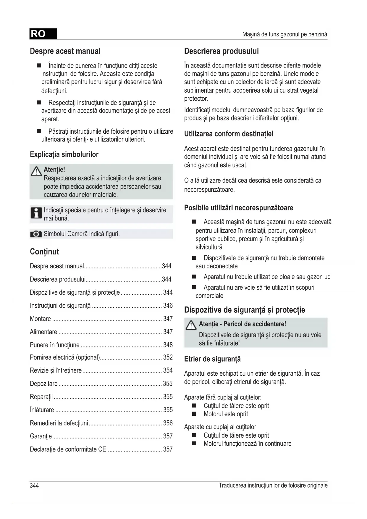 - Maşină de tuns gazonul pe benzină Conţinut Despre acest manual p. 344