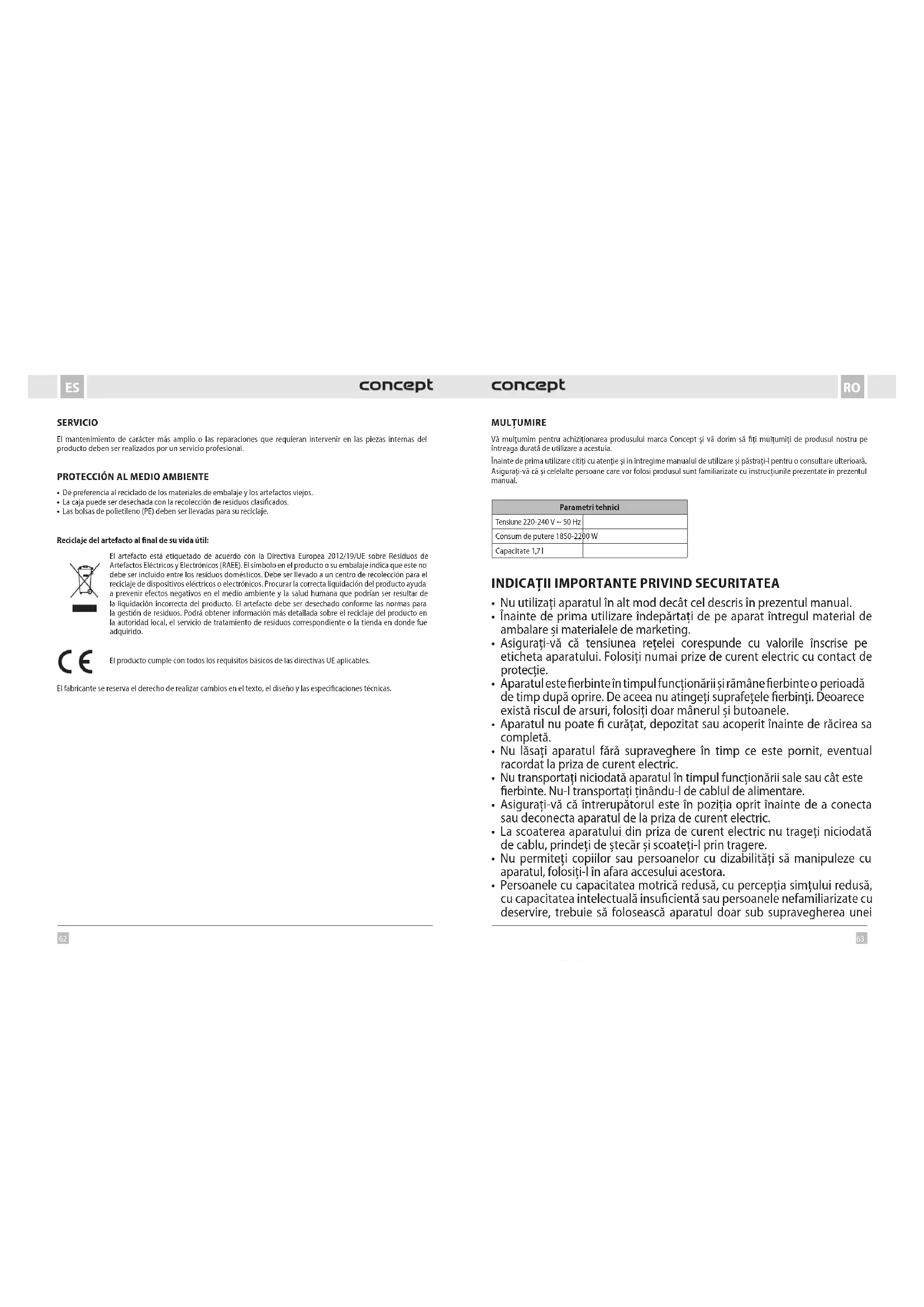 - Predați pungile din polietilenă (PE) la un centru de colectare a materialelor în vederea reciclării. Reciclarea aparatului la sfârșitul duratei de viață: Acest aparat este însemnat în conformitate cu Directiva Europeană 2012/19/UE privind deșeurile de echipamente electrice și electronice (DEEE). Simbolul de pe produs sau de pe ambalaj indică faptul că acest produs nu aparține deșeurilor menajere. Trebuie dus la un centru de colectare pentru reciclarea echipamentelor electrice și electronice. Prin asigurarea eliminării corecte a acestui produs veți contribui la prevenirea impactului negativ asupra mediului și a sănătății umane, care ar fi cauzate prin eliminare necorespunzătoare. Eliminarea trebuie efectuată în conformitate cu reglementările privind gestionarea deșeurilor. Informații mai detaliate privind reciclarea acestui produs veți obține de la autoritățile locale competente privind serviciile de eliminare a deșeurilor menajere sau în magazinul din care ați cumpărat produsul. Acest produs îndeplinește toate cerințele relevante de bază ale Directivei UE. Modificările textului, a designului și a specificațiilor tehnice pot fi făcute fără o atenționare prealabilă. Ne rezervăm dreptul la efectuarea acestor modificări.