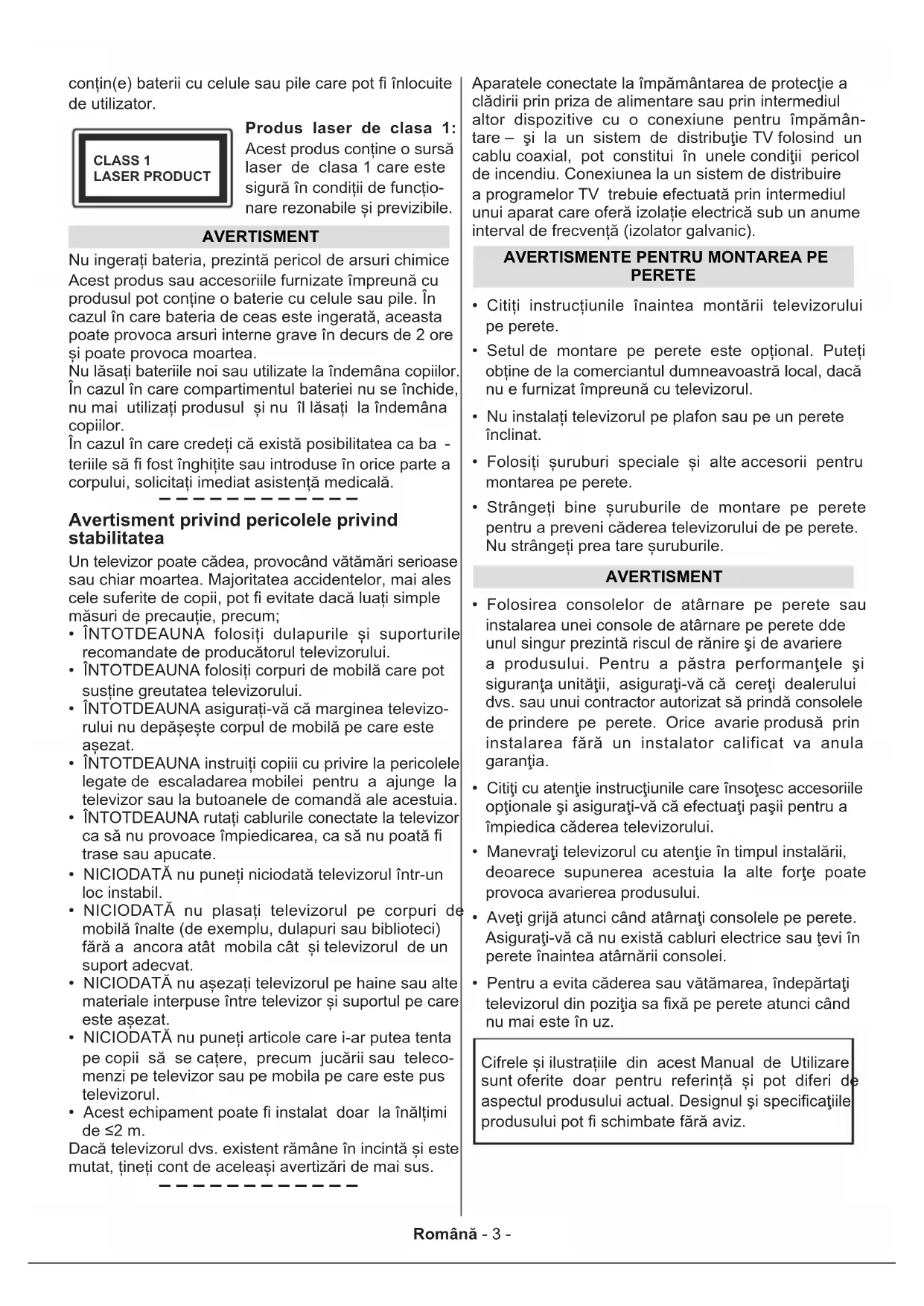 teriile să fost înghițite sau introduse în orice parte a corpului, solicitați imediat asistență medicală. – – – – – – – – – – – – Avertisment privind pericolele privind stabilitatea Un televizor poate cădea, provocând vătămări serioase sau chiar moartea. Majoritatea accidentelor, mai ales cele suferite de copii, pot evitate dacă luați simple măsuri de precauție, precum;