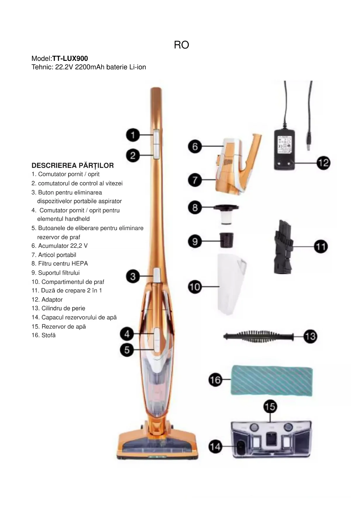 Deschideți capacul pentru rezervorul de apă (14) pentru a umple rezervorul de apă (15) cu apăși fixați-l, asamblațirezervoruldeapă (15) și cârpa (16) pe dispozitiv și porniți dispozitivul în mod normal. poate Măsurați podeaua prin ea!CURATENIE SI MENTENANTA Golirea șicurățarea compartimentului / filtrului de praf