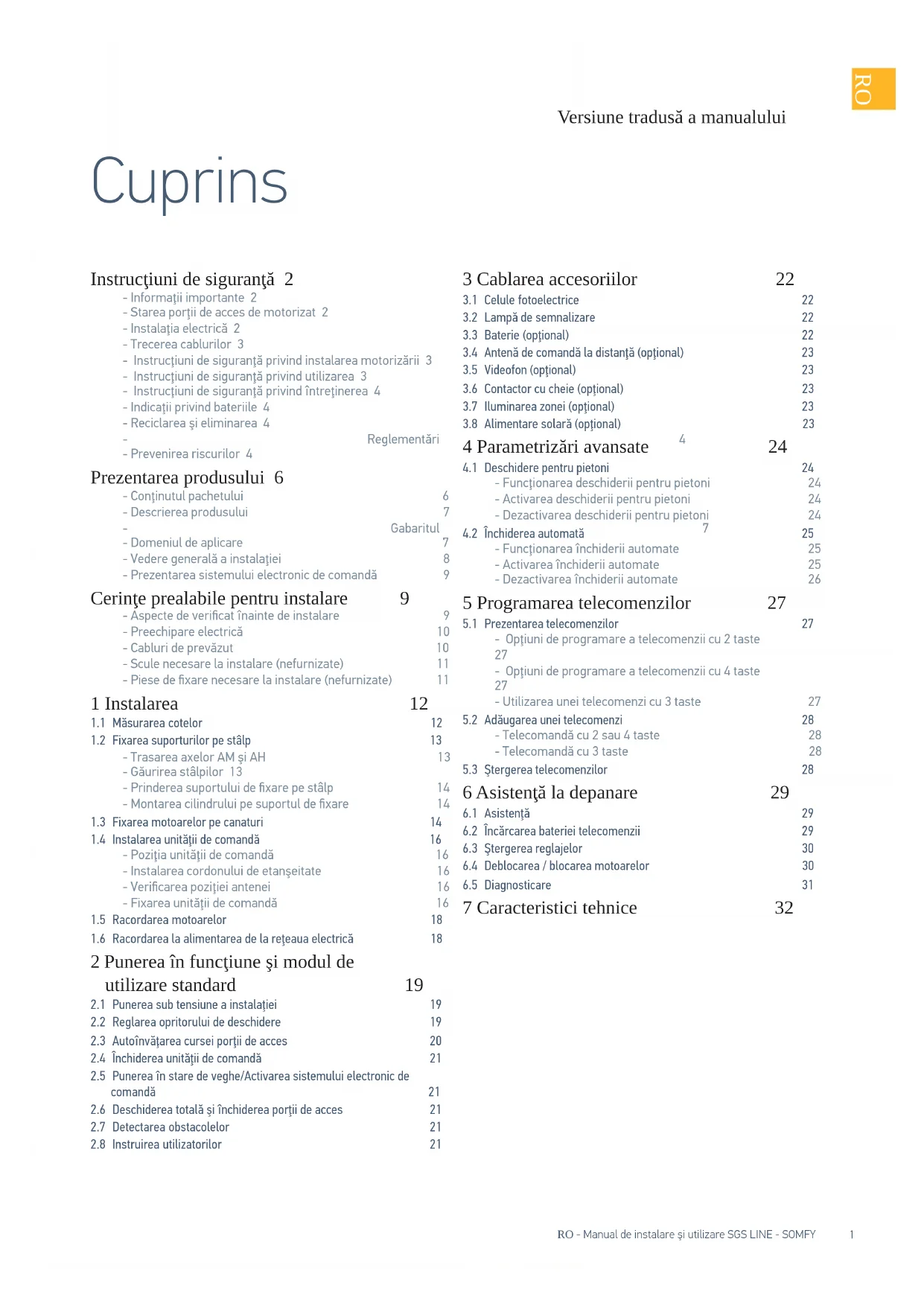 Versiune tradusă a manualului Cuprins Instrucţiuni de siguranţă 2 - Informaţii importante 2 - Starea porţii de acces de motorizat 2 - Instalaţia electrică 2 - Trecerea cablurilor 3 - Instrucţiuni de siguranţă privind instalarea motorizării 3 - Instrucţiuni de siguranţă privind utilizarea 3 - Instrucţiuni de siguranţă privind întreţinerea 4 - Indicaţii privind bateriile 4 - Reciclarea şi eliminarea 4 - Reglementări 4 - Prevenirea riscurilor 4 Prezentarea produsului 6 - Conţinutul pachetului 6 - Descrierea produsului 7 - Gabaritul 7 - Domeniul de aplicare 7 - Vedere generală a instalaţiei 8 - Prezentarea sistemului electronic de comandă 9 Cerinţe prealabile pentru instalare 9 - Aspecte de verificat înainte de instalare 9 - Preechipare electrică 10 - Cabluri de prevăzut 10 - Scule necesare la instalare (nefurnizate) 11 - Piese de fixare necesare la instalare (nefurnizate) 11 1 Instalarea 12