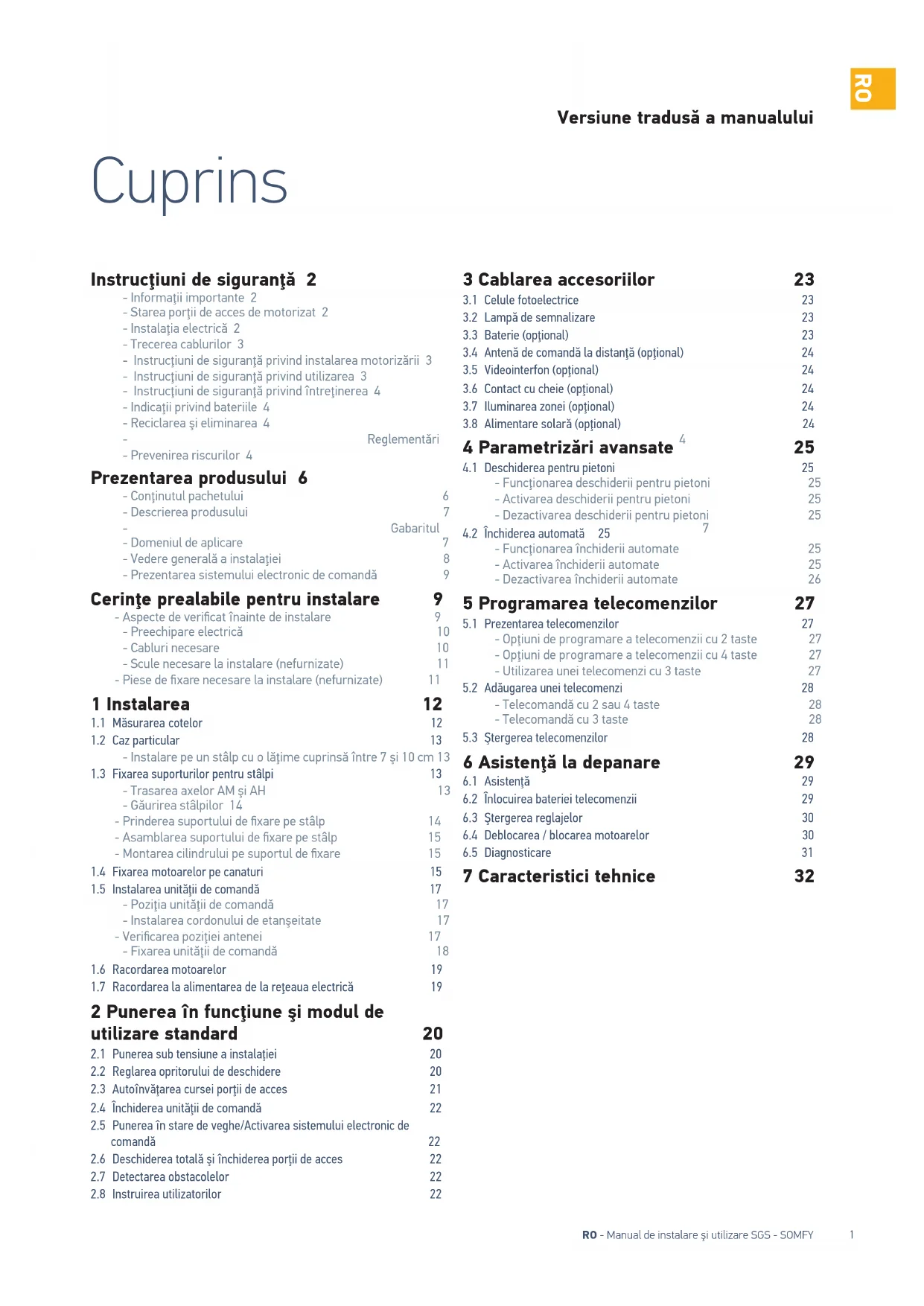 Versiune tradusă a manualului Cuprins Instrucţiuni de siguranţă 2 - Informaţii importante 2 - Starea porţii de acces de motorizat 2 - Instalaţia electrică 2 - Trecerea cablurilor 3 - Instrucţiuni de siguranţă privind instalarea motorizării 3 - Instrucţiuni de siguranţă privind utilizarea 3 - Instrucţiuni de siguranţă privind întreţinerea 4 - Indicaţii privind bateriile 4 - Reciclarea şi eliminarea 4 - Reglementări 4 - Prevenirea riscurilor 4 Prezentarea produsului 6 - Conţinutul pachetului 6 - Descrierea produsului 7 - Gabaritul 7 - Domeniul de aplicare 7 - Vedere generală a instalaţiei 8 - Prezentarea sistemului electronic de comandă 9 Cerinţe prealabile pentru instalare 9 - Aspecte de verifi cat înainte de instalare 9 - Preechipare electrică 10 - Cabluri necesare 10 - Scule necesare la instalare (nefurnizate) 11 - Piese de fi xare necesare la instalare (nefurnizate) 11 1 Instalarea 12