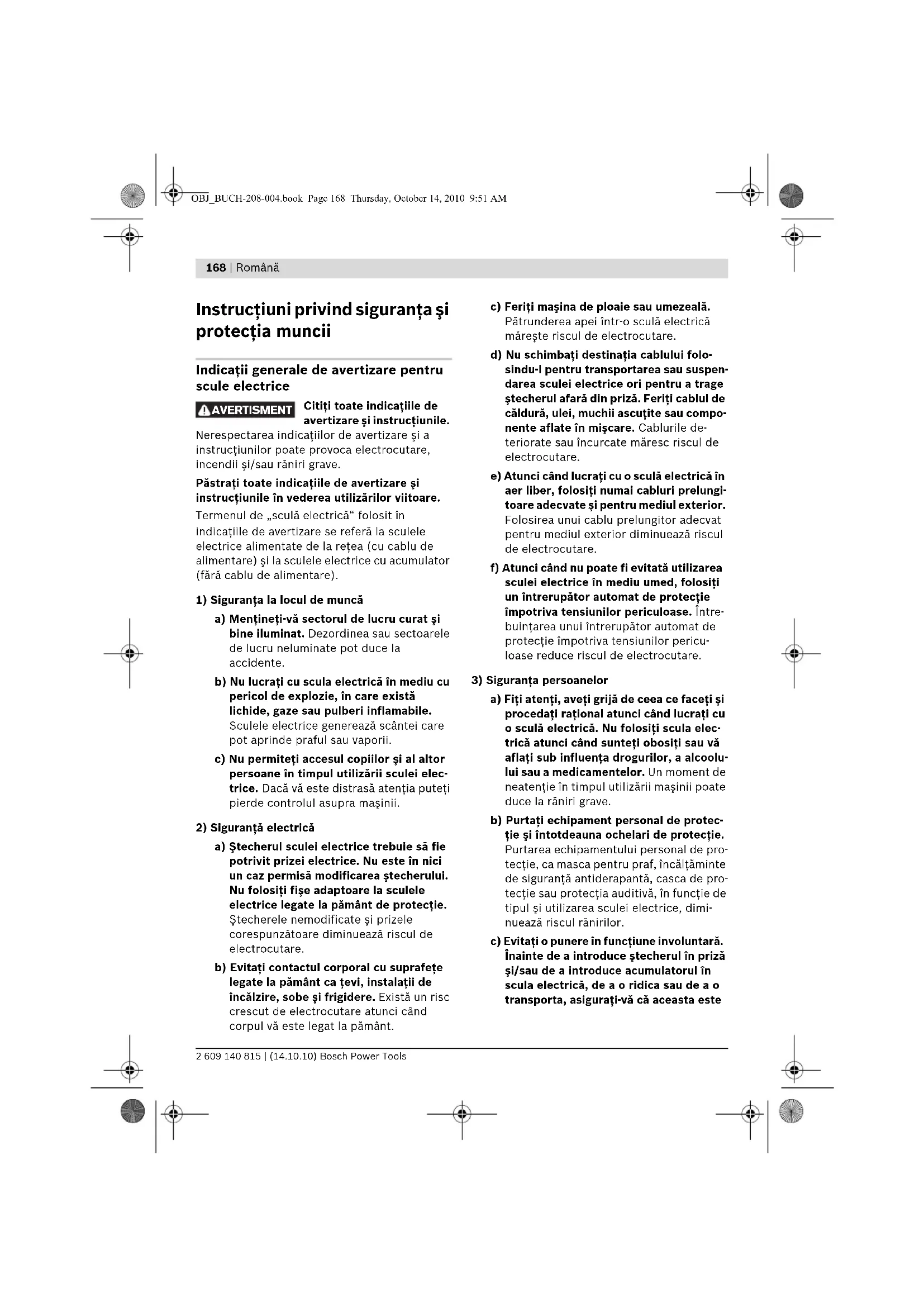 a) Fiţi atenţi, aveţi grijă de ceea ce faceţi şi procedaţi raţional atunci când lucraţi cu o sculă electrică. Nu folosiţi scula elec- trică atunci când sunteţi obosiţi sau vă aflaţi sub influenţa drogurilor, a alcoolu- lui sau a medicamentelor. Un moment de neatenţie în timpul utilizării maşinii poate duce la răniri grave. b) Purtaţi echipament personal de protec- ţie şi întotdeauna ochelari de protecţie. Purtarea echipamentului personal de pro- tecţie, ca masca pentru praf, încălţăminte de siguranţă antiderapantă, casca de pro- tecţie sau protecţia auditivă, în funcţie de tipul şi utilizarea sculei electrice, dimi- nuează riscul rănirilor. c) Evitaţi o punere în funcţiune involuntară. Înainte de a introduce ştecherul în priză şi/sau de a introduce acumulatorul în scula electrică, de a o ridica sau de a o transporta, asiguraţi-vă că aceasta este AVERTISMENT OBJ_BUCH-208-004.book Page 168 Thursday, October 14, 2010 9:51 AMRomână | 169 Bosch Power Tools 2 609 140 815 | (14.10.10) oprită. Dacă atunci când transportaţi scu- la electrică ţineţi degetul pe întrerupător sau dacă porniţi scula electrică înainte de a o racorda la reţeaua de curent, puteţi provoca accidente. d) Înainte de pornirea sculei electrice în- depărtaţi dispozitivele de reglare sau cheile fixe din aceasta. Un dispozitiv sau o cheie lăsată într-o componentă de maşi- nă care se roteşte poate duce la răniri. e) Evitaţi o ţinută corporală nefirească. Adoptaţi o poziţie stabilă şi menţineţi-vă întotdeauna echilibrul. Astfel veţi putea controla mai bine maşina în situaţii neaşteptate. f) Purtaţi îmbrăcăminte adecvată. Nu pur- taţi îmbrăcăminte largă sau podoabe. Feriţi părul, îmbrăcămintea şi mănuşile de piesele aflate în mişcare. Îmbrăcămin- tea largă, părul lung sau podoabele pot fi prinse în piesele aflate în mişcare. g) Dacă pot fi montate echipamente de aspirare şi colectare a prafului, asigu- raţi-vă că acestea sunt racordate şi folosite în mod corect. Folosirea unei instalaţii de aspirare a prafului poate duce la reducerea poluării cu praf.