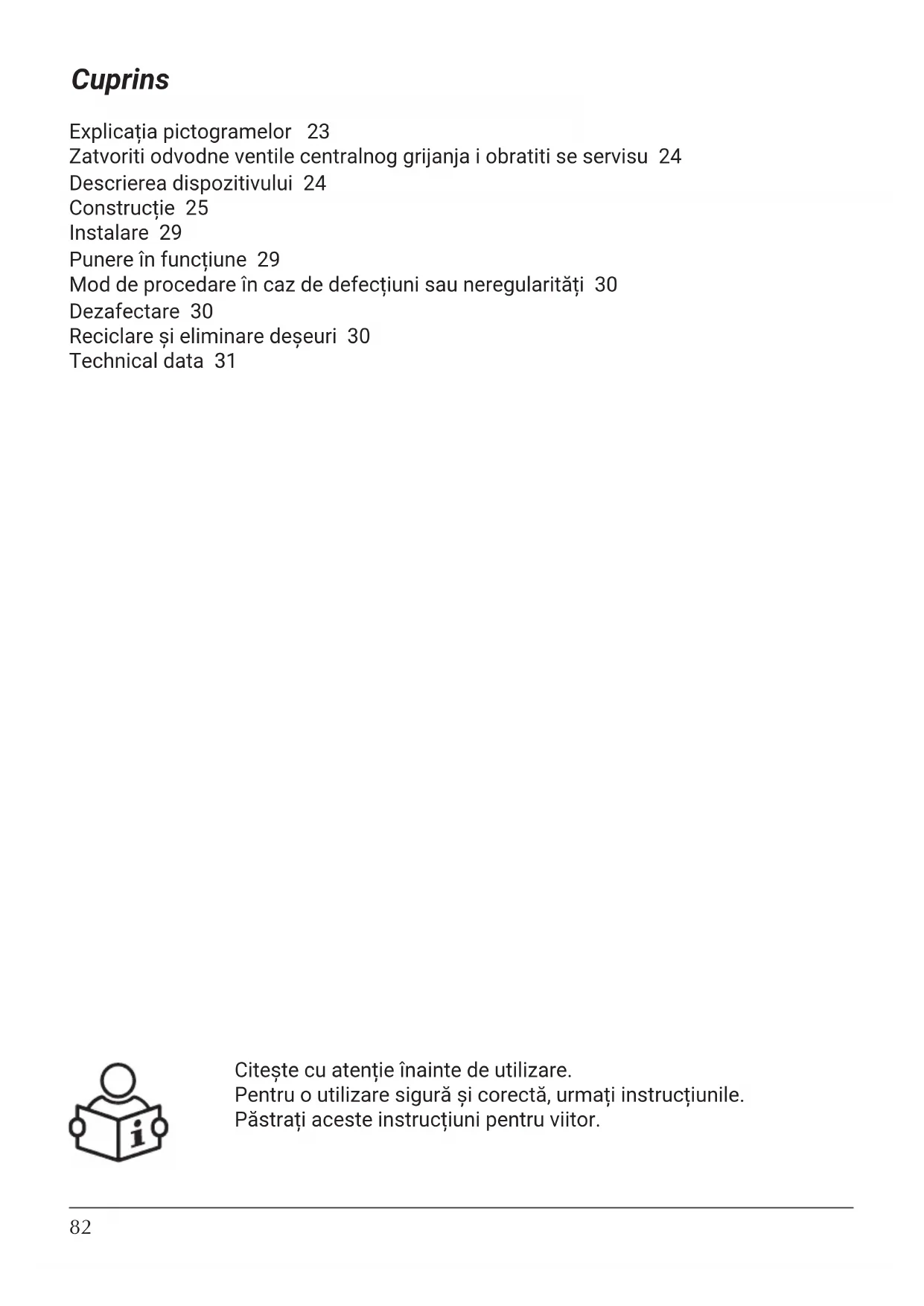 65* - 90* - 105* 7** 14** 16** 21** - 28* - 32** Tömeg (víz nélkül) kg 53 69 56 85 86 118 96 131 128 170 150 196 HU82 Cuprins Explicația pictogramelor 23 Zatvoriti odvodne ventile centralnog grijanja i obratiti se servisu 24 Descrierea dispozitivului 24 Construcție 25 Instalare 29 Punere în funcțiune 29 Mod de procedare în caz de defecțiuni sau neregularități 30 Dezafectare 30 Reciclare și eliminare deșeuri 30 Technical data 31 Citește cu atenție înainte de utilizare. Pentru o utilizare sigură și corectă, urmați instrucțiunile. Păstrați aceste instrucțiuni pentru viitor.83 PL;DE;EN;ES;FR;NL;HR;HU;RO-061_f.1973 Vă rugăm să respectați cu strictețe instrucțiunile de siguranță pentru a elimina riscul de vătămare și a cauza daune materiale. Pericol Acest semn avertizează asupra riscului de vătămare. Atenție Acest semn avertizează împotriva daunelor materiale și poluării mediului. Sfat Textul marcat cu cuvântul Sfat oferă informații suplimentare.. Indicarea faptului că instrucțiunile de utilizare ar trebui luate în considerare în timpul utilizării aparatului sau al controlului în apropierea locului unde este amplasat simbolul. Reglementările în vigoare