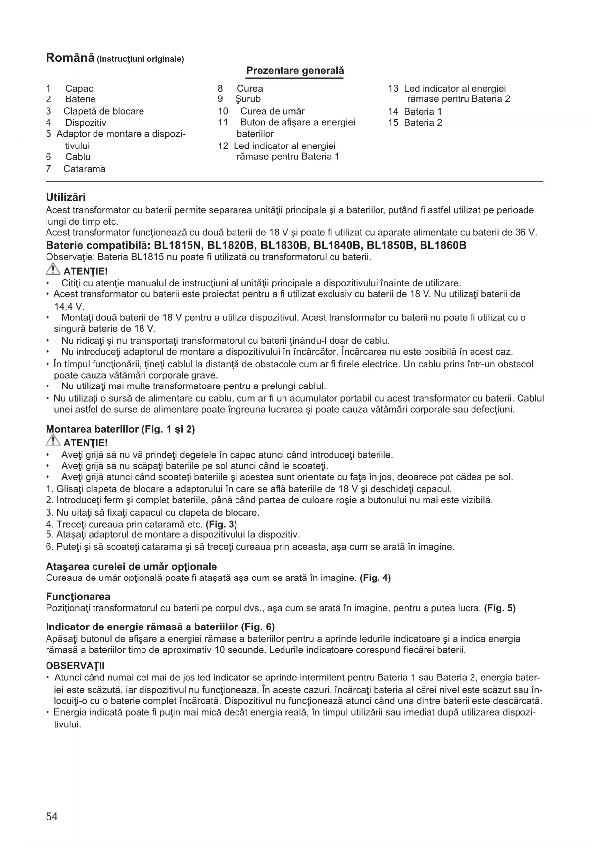 - Aveţigrijăatuncicândscoateţibateriileşiacesteasuntorientatecufaţaînjos,deoarecepotcădeapesol. 1.Glisaţiclapetadeblocareaadaptoruluiîncareseaăbateriilede18Vşideschideţicapacul. 2.Introduceţifermşicompletbateriile,pânăcândparteadeculoareroşieabutonuluinumaiestevizibilă. 3.Nuuitaţisăxaţicapaculcuclapetadeblocare. 4.Treceţicureauaprincataramăetc.(Fig. 3) 5.Ataşaţiadaptoruldemontareadispozitivuluiladispozitiv. 6.Puteţişisăscoateţicataramaşisătreceţicureauaprinaceasta,aşacumsearatăînimagine. Ataşarea curelei de umăr opţionale Cureauadeumăropţionalăpoateataşatăaşacumsearatăînimagine.(Fig. 4) Funcţionarea Poziţionaţitransformatorulcubateriipecorpuldvs.,aşacumsearatăînimagine,pentruaputealucra.(Fig. 5) Indicator de energie rămasă a bateriilor (Fig. 6) Apăsaţibutonuldeaşareaenergieirămaseabateriilorpentruaaprindeledurileindicatoareşiaindicaenergia rămasăabateriilortimpdeaproximativ10secunde.Ledurileindicatoarecorespundecăreibaterii. OBSERVAŢII