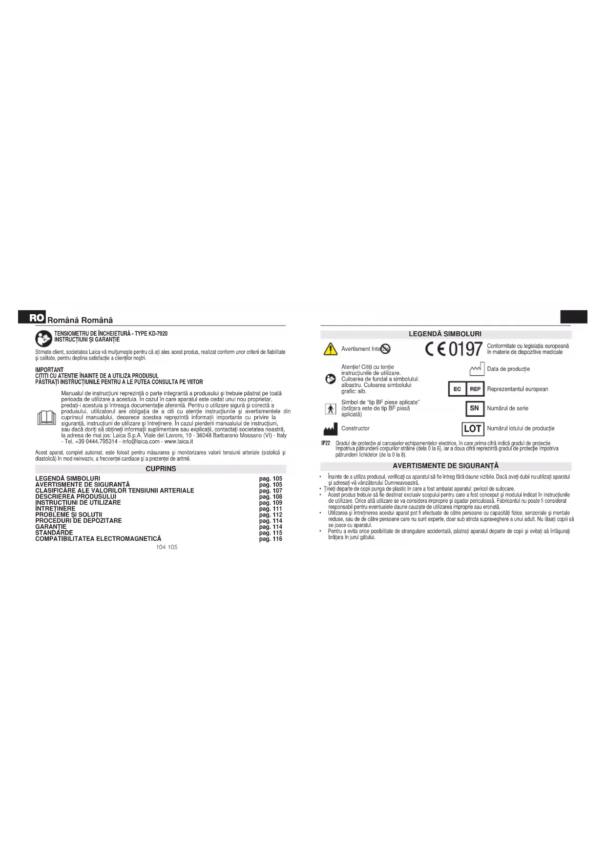 Πίνακας 3 – Πεδία γειτνίασης από εξοπλισμό ασύρματης επικοινωνίας με ραδιοσυχνότητες104 105TENSIOMETRU DE ÎNCHEIETURĂ - TYPE KD-7920INSTRUCŢIUNI ŞI GARANŢIE Stimate client, societatea Laica vă mulţumeşte pentru că aţi ales acest produs, realizat conform unor criterii de fiabilitate şi calitate, pentru deplina satisfacţie a clienţilor noştri.IMPORTANTCITIŢI CU ATENŢIE ÎNAINTE DE A UTILIZA PRODUSULPĂSTRAŢI INSTRUCŢIUNILE PENTRU A LE PUTEA CONSULTA PE VIITORManualul de instrucţiuni reprezintă o parte integrantă a produsului şi trebuie păstrat pe toată perioada de utilizare a acestuia. În cazul în care aparatul este cedat unui nou proprietar, predaţi-i acestuia şi întreaga documentaţie aferentă. Pentru o utilizare sigură şi corectă a produsului, utilizatorul are obligaţia de a citi cu atenţie instrucţiunile şi avertismentele din cuprinsul manualului, deoarece acestea reprezintă informaţii importante cu privire la siguranţă, instrucţiuni de utilizare şi întreţinere. În cazul pierderii manualului de instrucţiuni, sau dacă doriţi să obţineţi informaţii suplimentare sau explicaţii, contactaţi societatea noastră, la adresa de mai jos: Laica S.p.A. Viale del Lavoro, 10 - 36048 Barbarano Mossano (VI) - Italy - Tel. +39 0444.795314 - info@laica.com - www.laica.it Acest aparat, complet automat, este folosit pentru măsurarea şi monitorizarea valorii tensiunii arteriale (sistolică şi diastolică) în mod neinvaziv, a frecvenţei cardiace şi a prezenţei de aritmii. CUPRINS LEGENDĂ SIMBOLURIAVERTISMENTE DE SIGURANŢĂCLASIFICĂRE ALE VALORILOR TENSIUNII ARTERIALEDESCRIEREA PRODUSULUIINSTRUCŢIUNI DE UTILIZAREÎNTREŢINEREPROBLEME ŞI SOLUŢIIPROCEDURI DE DEPOZITAREGARANŢIESTANDARDECOMPATIBILITATEA ELECTROMAGNETICĂpag. 105pag. 105pag. 107pag. 108pag. 109pag. 111pag. 112pag. 114pag. 114pag. 115pag. 116 LEGENDĂ SIMBOLURI Avertisment InterzisConformitate cu legislația europeană în materie de dispozitive medicaleAtenţie! Citiţi cu tenţie instrucţiunile de utilizare. Culoarea de fundal a simbolului: albastru. Culoarea simbolului grafic: alb.Data de producţieReprezentantul europeanSimbol de “tip BF piese aplicate” (brăţara este de tip BF piesă aplicată) Numărul de serieConstructor LOT Numărul lotului de producţie IP22: Gradul de protecţie al carcaselor echipamentelor electrice, în care prima cifră indică gradul de protecţie împotriva pătrunderii corpurilor străine (dela 0 la 6), iar a doua cifră reprezintă gradul de protecţie împotriva pătrunderii lichidelor (de la 0 la 8).