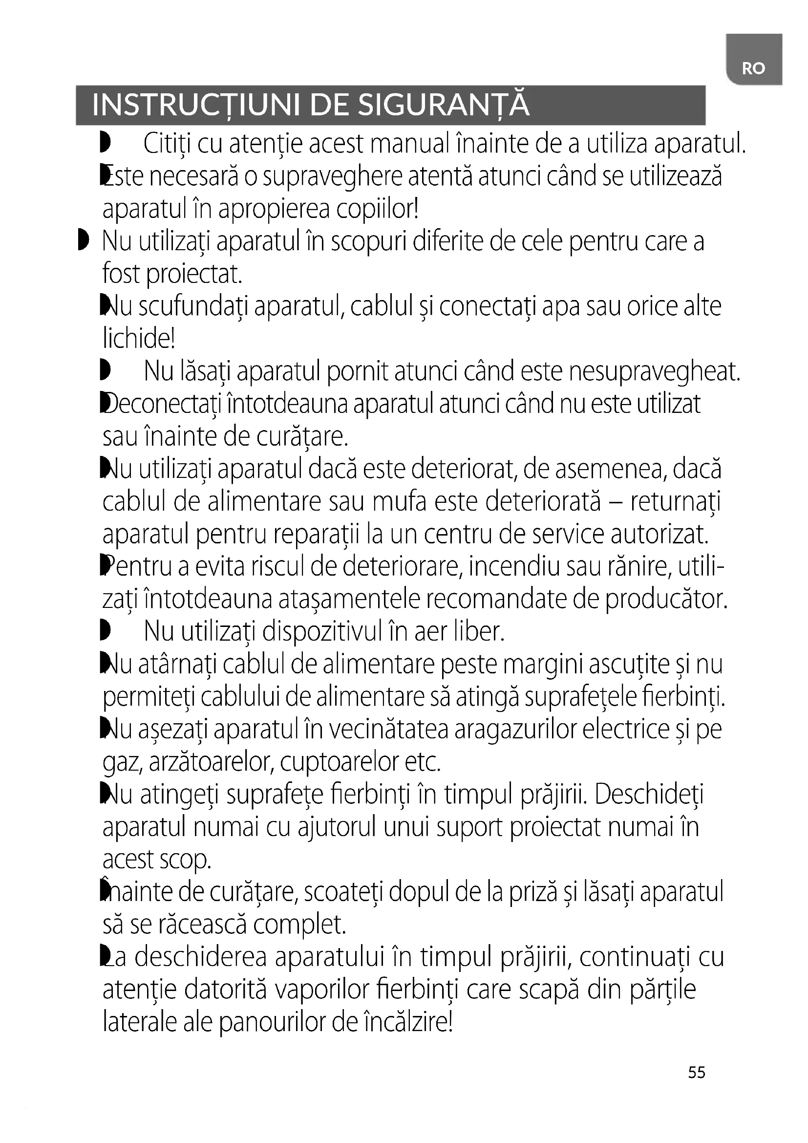 La deschiderea aparatului în timpul prăjirii, continuați cu atenție datorită vaporilor fierbinți care scapă din părțile laterale ale panourilor de încălzire!56