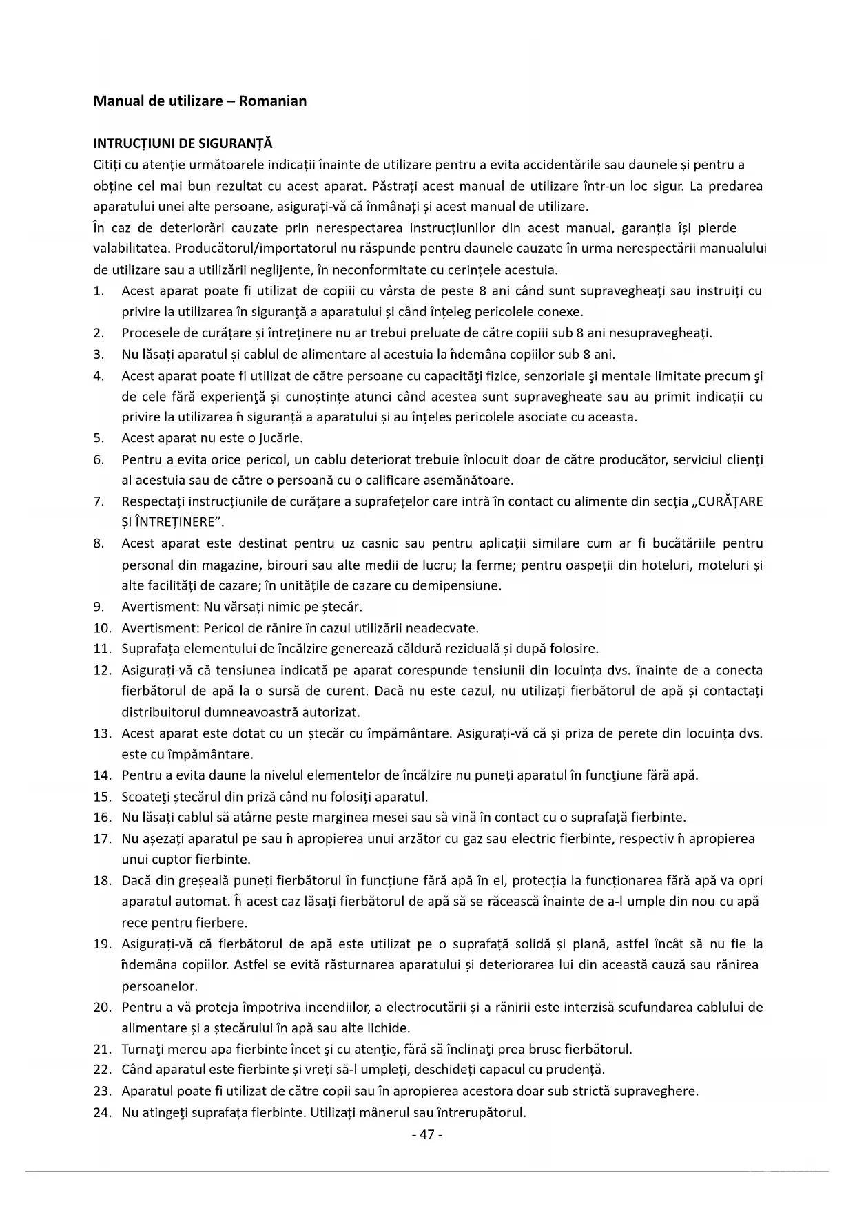 33. Fierbătorul de apă este destinat exclusiv uzului casnic și nu trebuie folosit în aer liber.