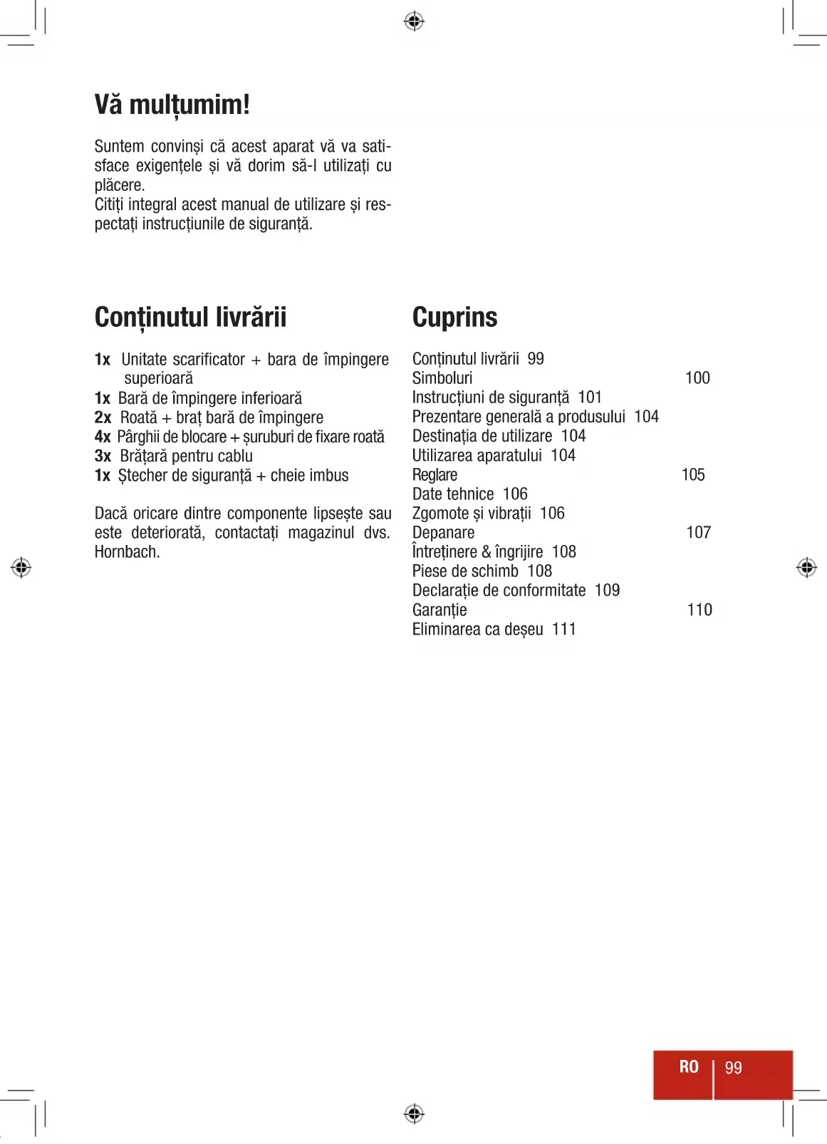 Vă mulţumim! Suntem convinşi că acest aparat vă va sati- sface exigenţele şi vă dorim să-l utilizaţi cu plăcere. Citiţi integral acest manual de utilizare şi res- pectaţi instrucţiunile de siguranţă. Conţinutul livrării 1x Unitate scarificator + bara de împingere superioară 1x Bară de împingere inferioară 2x Roată + braţ bară de împingere 4x Pârghii de blocare + şuruburi de fixare roată 3x Brăţară pentru cablu 1x Ştecher de siguranţă + cheie imbus Dacă oricare dintre componente lipseşte sau este deteriorată, contactaţi magazinul dvs. Hornbach. Cuprins Conţinutul livrării 99 Simboluri 100 Instrucţiuni de siguranţă 101 Prezentare generală a produsului 104 Destinaţia de utilizare 104 Utilizarea aparatului 104 Reglare 105 Date tehnice 106 Zgomote şi vibraţii 106 Depanare 107 Întreţinere & îngrijire 108 Piese de schimb 108 Declaraţie de conformitate 109 Garanţie 110 Eliminarea ca deşeu 111RO
