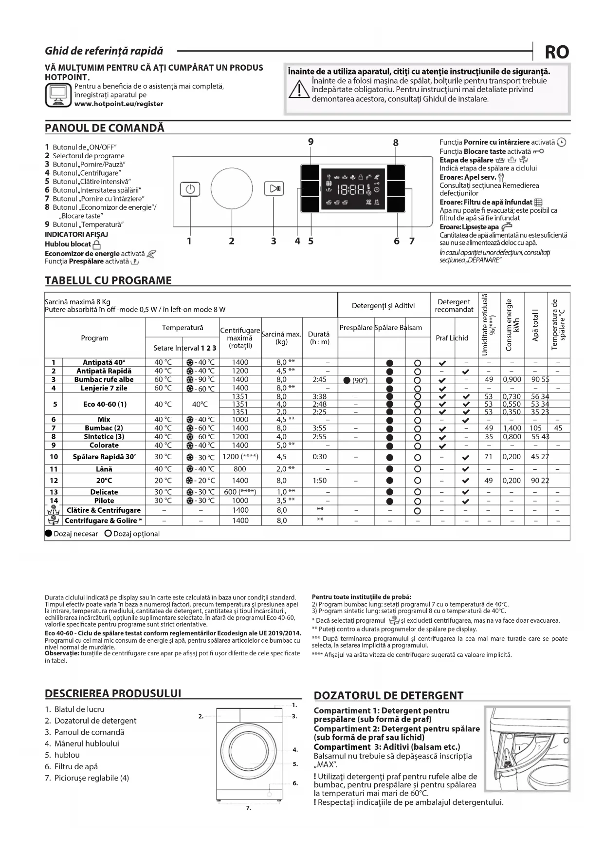 Pentru a benecia de o asistenă mai completă, înregistrai aparatul pe www.hotpoint.eu/registerSarcină maximă 8 KgPutere absorbită în o -mode 0,5 W / în left-on mode 8 WDetergeni i AditiviDetergent recomandat Umiditate reziduală %(***)Consum energie kWh Apă total lTemperatura de spălare °CProgramTemperaturăCentrifugare maximă (rotaii)Sarcină max. (kg) Durată(h : m)Prespălare Spălare BalsamPraf LichidSetare Interval 1 2 31 Antipată 40° 40 °C - 40 °C 1400 8,0 ** –