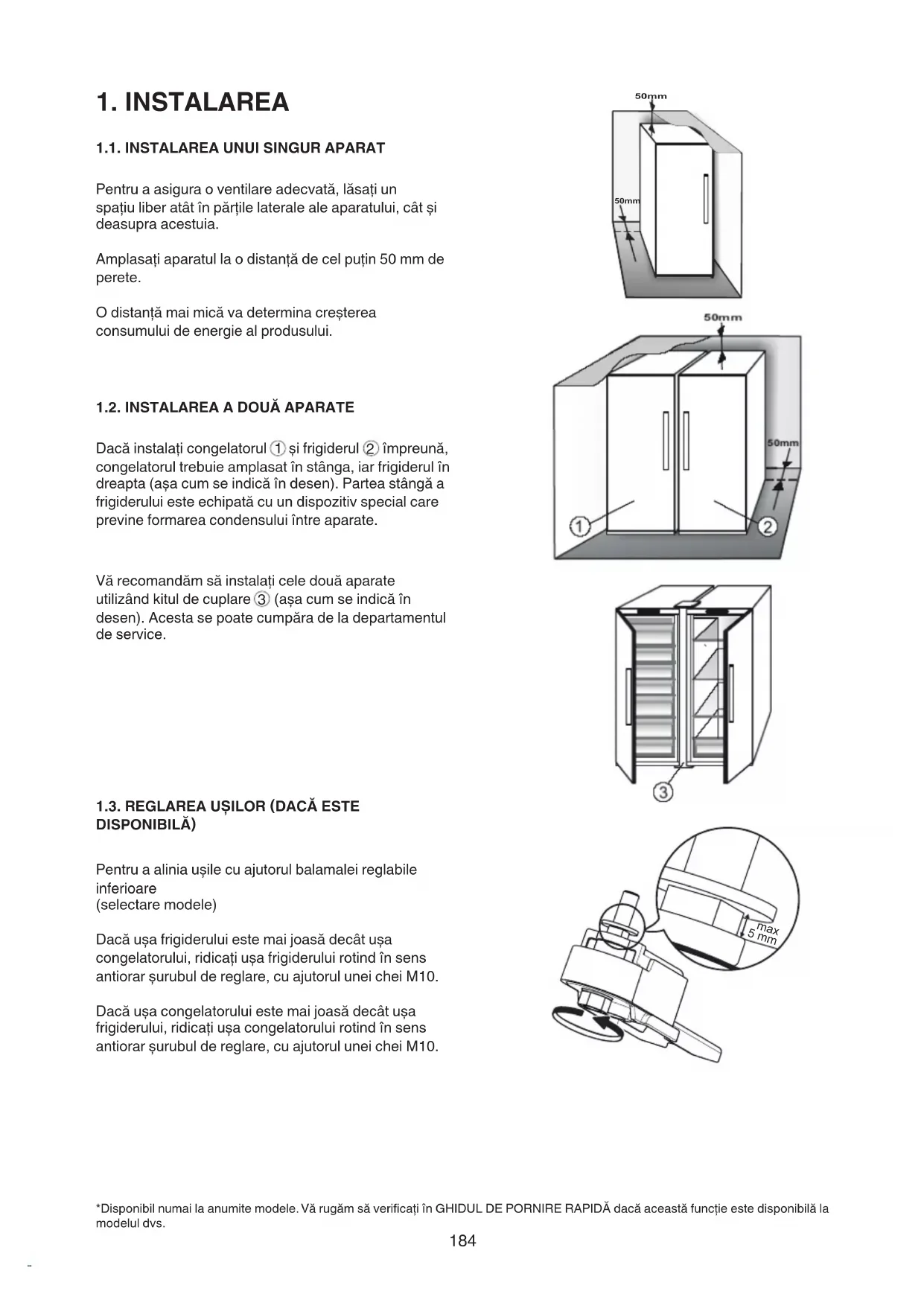 DISPONIBILĂ) Pentruaaliniauşilecuajutorulbalamaleireglabile inferioare (selectaremodele) Dacăuşafrigideruluiestemaijoasădecâtuşa congelatorului,ridicaţiuşafrigideruluirotindînsens antiorarşurubuldereglare,cuajutoruluneicheiM10. Dacăuşacongelatoruluiestemaijoasădecâtuşa frigiderului,ridicaţiuşacongelatoruluirotindînsens antiorarşurubuldereglare,cuajutoruluneicheiM10. *Disponibilnumailaanumitemodele.VărugămsăverificaţiînGHIDULDEPORNIRERAPIDĂdacăaceastăfuncţieestedisponibilăla modeluldvs. 50mm 50mm 5 mm max185