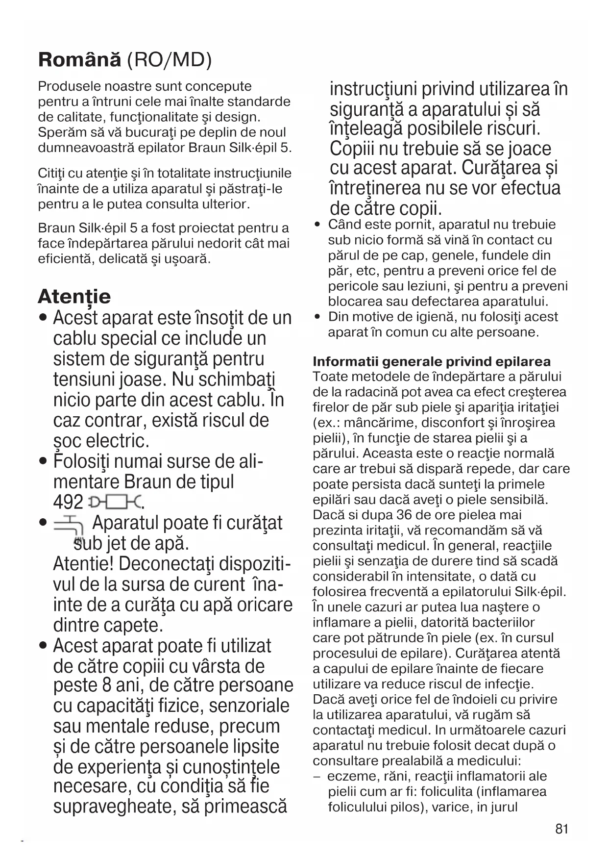 - Din motive de igienă, nu folosiţi acest aparat în comun cu alte persoane. Informatii generale privind epilarea Toate metodele de îndepărtare a părului de la radacină pot avea ca efect creşterea firelor de păr sub piele şi apariţia iritaţiei (ex.: mâncărime, disconfort şi înroşirea pielii), în funcţie de starea pielii şi a părului. Aceasta este o reacţie normală care ar trebui să dispară repede, dar care poate persista dacă sunteţi la primele epilări sau dacă aveţi o piele sensibilă. Dacă si dupa 36 de ore pielea mai prezinta iritaţii, vă recomandăm să vă consultaţi medicul. În general, reacţiile pielii şi senzaţia de durere tind să scadă considerabil în intensitate, o dată cu folosirea frecventă a epilatorului Silk·épil. În unele cazuri ar putea lua naştere o inflamare a pielii, datorită bacteriilor care pot pătrunde în piele (ex. în cursul procesului de epilare). Curăţarea atentă a capului de epilare înainte de fiecare utilizare va reduce riscul de infecţie. Dacă aveţi orice fel de îndoieli cu privire la utilizarea aparatului, vă rugăm să contactaţi medicul. In următoarele cazuri aparatul nu trebuie folosit decat după o consultare prealabilă a medicului: – eczeme, răni, reacţii inflamatorii ale pielii cum ar fi: foliculita (inflamarea foliculului pilos), varice, in jurul Română (RO/MD) 90340813_SE5_Power_MN.indd 8190340813_SE5_Power_MN.indd 81 02.06.22 10:4902.06.22 10:4982 aluniţelor, imunitate scăzută a pielii ex. diabet zaharat, in timpul sarcinii, boala Raynaud, hemofilie, candida sau imunodeficienţă. Cateva sfaturi utile Dacă nu aţi mai folosit un epilator sau dacă nu v-aţi mai epilat de mult timp, pielea dumneavoastră ar putea avea nevoie de o scurtă perioadă de adaptare. Disconfortul pe care îl veti resimţi la început va scădea considerabil o dată cu folosirea repetată a epilatorului, pe masură ce pielea se adaptează procesului. Epilarea se efectuează mai uşor şi mai confortabil atunci când părul are o lungime optimă de 2-5 mm. Dacă părul este mai lung, vă recomandăm să vă radeţi mai întâi şi să epilaţi părul mai scurt care reapare, după 1 sau 2 săptămâni. Dacă vă epilaţi pentru prima dată, este indicat să efectuaţi operaţiunea seara, astfel ca orice posibile înroşiri ale pielii să dispară pe timpul nopţii. Pentru a relaxa pielea vă recomandăm să aplicaţi după epilare o cremă hidratantă. Părul fin care reapare după epilare poate să crească în interiorul suprafeţei pielii. Utilizarea regulată a bureţilor pentru masaj (ex.: după duş) sau a produselor de exfoliere şi gomaj ajută la prevenirea creşterii părului sub piele, deoarece acţiunea de frecare uşoară îndepartează stratul de piele superficial, iar firele fine pot ieşi la suprafaţa pielii. Descriere 1a Sistem de masaj de înaltă frecvenţă 1b Cap pentru contactul cu pielea* 2 Cap de epilare cu pensete 3 Sistem de iluminare 4 Comutator pornit/oprit 5 Buton de eliberare 6 Cablu special 7 Cap pentru ras cu dispozitiv de tăiere pentru păr lung*