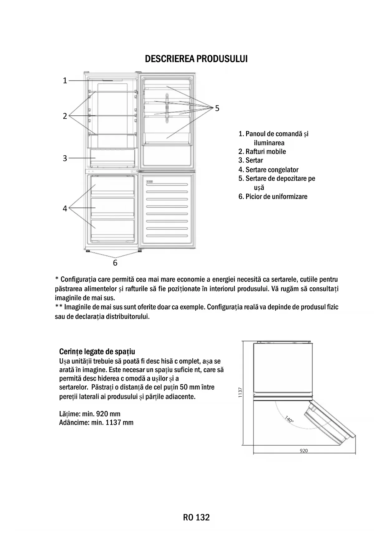 - Configurația care permită cea mai mare economie a energiei necesită ca sertarele, cutiile pentru păstrarea alimentelor și rafturile să fie poziționate în interiorul produsului. Vă rugăm să consultați imaginile de mai sus. ** Imaginile de mai sus sunt oferite doar ca exemple. Configurația reală va depinde de produsul fizic sau de declarația distribuitorului. Cerințe legate de spațiu Ușa unității trebuie să poată fi desc hisă c omplet, așa se arată în imagine. Este nec esar un spațiu suficie nt, care să permită desc hiderea c omodă a ușilor și a sertarelor. Păstrați o distanță de cel puțin 50 mm între pereții laterali ai produsului și părțile adiacente. Lățime: min. 920 mm Adâncime: min. 1137 mm
