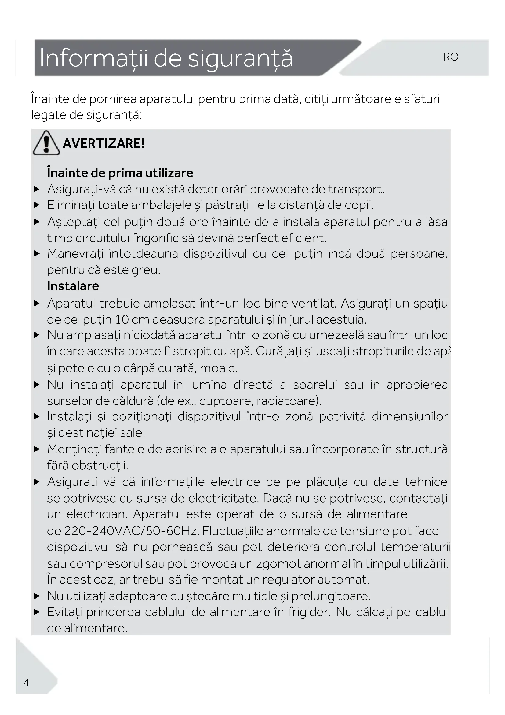 AVERTIZARE! Înainte de prima utilizare Asigurați-vă că nu există deteriorări provocate de transport. Eliminați toate ambalajele și păstrați-le la distanță de copii. Așteptați cel puțin două ore înainte de a instala aparatul pentru a lăsa timp circuitului frigorific să devină perfect eficient. Manevrați întotdeauna dispozitivul cu cel puțin încă două persoane, pentru că este greu. Instalare Aparatul trebuie amplasat într-un loc bine ventilat. Asigurați un spațiu de cel puțin 10 cm deasupra aparatului și în jurul acestuia. Nu amplasați niciodată aparatul într-o zonă cu umezeală sau într-un loc în care acesta poate fi stropit cu apă. Curățați și uscați stropiturile de apă și petele cu o cârpă curată, moale. Nu instalați aparatul în lumina directă a soarelui sau în apropierea surselor de căldură (de ex., cuptoare, radiatoare). Instalați și poziționați dispozitivul într-o zonă potrivită dimensiunilor și destinației sale. Mențineți fantele de aerisire ale aparatului sau încorporate în structură fără obstrucții. Asigurați-vă că informațiile electrice de pe plăcuța cu date tehnice se potrivesc cu sursa de electricitate. Dacă nu se potrivesc, contactați un electrician. Aparatul este operat de o sursă de alimentare de 220-240VAC/50-60Hz. Fluctuațiile anormale de tensiune pot face dispozitivul să nu pornească sau pot deteriora controlul temperaturii sau compresorul sau pot provoca un zgomot anormal în timpul utilizării. În acest caz, ar trebui să fie montat un regulator automat. Nu utilizați adaptoare cu ștecăre multiple și prelungitoare. Evitați prinderea cablului de alimentare în frigider. Nu călcați pe cablul de alimentare.RO Informații de siguranță