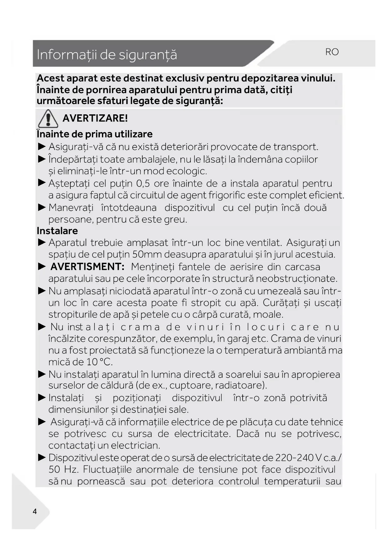 ► Manevrați întotdeauna dispozitivul cu cel puțin încă două persoane, pentru că este greu. Instalare ► Aparatul trebuie amplasat într- un loc bine ventilat. Asigurați un spațiu de cel puțin 50mm deasupra aparatului și în jurul acestuia. ► AVERTISMENT: Mențineți fantele de aerisire din carcasa aparatului sau pe cele încorporate în structură neobstrucționate. ► Nu amplasați niciodată aparatul într-o zonă cu umezeală sau într- un loc în care acesta poate fi stropit cu apă. Curățați și uscați stropiturile de apă și petele cu o cârpă curată, moale. ► Nu ins talați crama de vinuri în locuri care nu sunt izolate sau încălzite corespunzător, de exemplu, în garaj etc. Crama de vinuri nu a fost proiectată să funcționeze la o temperatură ambiantă mai mică de 10 °C. ► Nu instalați aparatul în lumina directă a soarelui sau în apropierea surselor de căldură (de ex., cuptoare, radiatoare). ► Instalați și poziționați dispozitivul într- o zonă potrivită dimensiunilor și destinației sale. ► Asigurați- vă că informațiile electrice de pe plăcuța cu date tehnice se potrivesc cu sursa de electricitate. Dacă nu se potrivesc, contactați un electrician. ► Dispozitivul este operat de o sursă de electricitate de 220-240 V c.a./