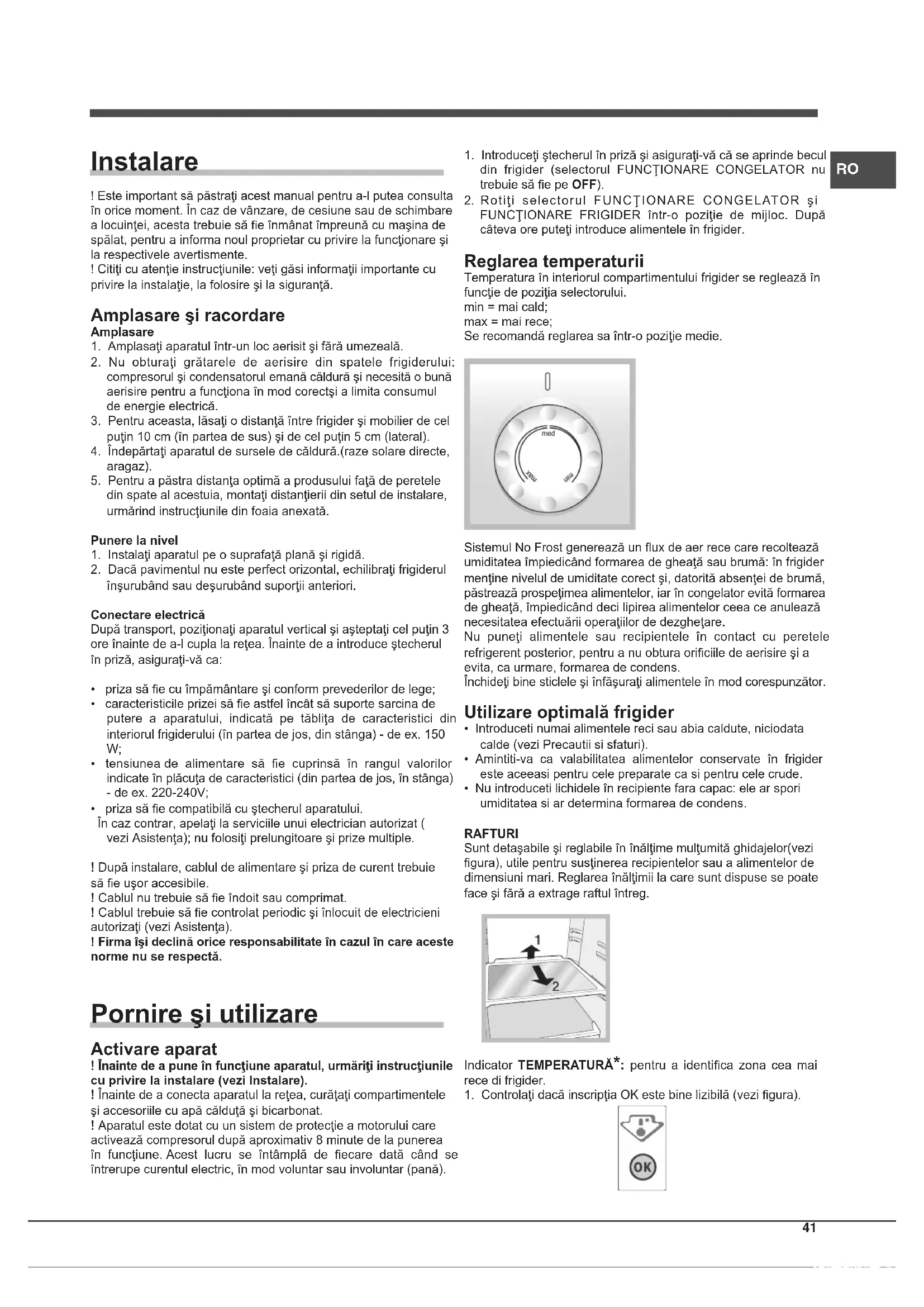 FUNCŢIONARE FRIGIDER într-o poziţie de mijloc. După câteva ore puteţi introduce alimentele în frigider. Reglarea temperaturii Temperatura în interiorul compartimentului frigider se reglează în funcţie de poziţia selectorului. min = mai cald; max = mai rece; Se recomandă reglarea sa într-o poziţie medie. Sistemul No Frost generează un ux de aer rece care recoltează umiditatea împiedicând formarea de gheaţă sau brumă: în frigider menţine nivelul de umiditate corect şi, datorită absenţei de brumă, păstrează prospeţimea alimentelor, iar în congelator evită formarea de gheaţă, împiedicând deci lipirea alimentelor ceea ce anulează necesitatea efectuării operaţiilor de dezgheţare. Nu puneţi alimentele sau recipientele în contact cu peretele refrigerent posterior, pentru a nu obtura oriciile de aerisire şi a evita, ca urmare, formarea de condens. Închideţi bine sticlele şi înfăşuraţi alimentele în mod corespunzător. Utilizare optimală frigider