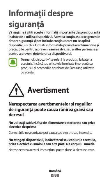Informaţii despre siguranţă Vă rugăm să citiţi aceste informaţii importante despre siguranţă înainte de a utiliza dispozitivul. Acestea conţin aspecte generale despre siguranţă şi pot include conţinut care nu se aplică dispozitivului dvs. Urmaţi informaţiile privind avertismentele şi precauţiile pentru a preveni rănirea dvs. sau a altor persoane şi pentru a preveni deteriorarea dispozitivului. Termenul „dispozitiv” se referă la produs și la bateria acestuia, încărcător, articolele furnizate împreună cu produsul și accesoriile aprobate de Samsung utilizate cu acesta.