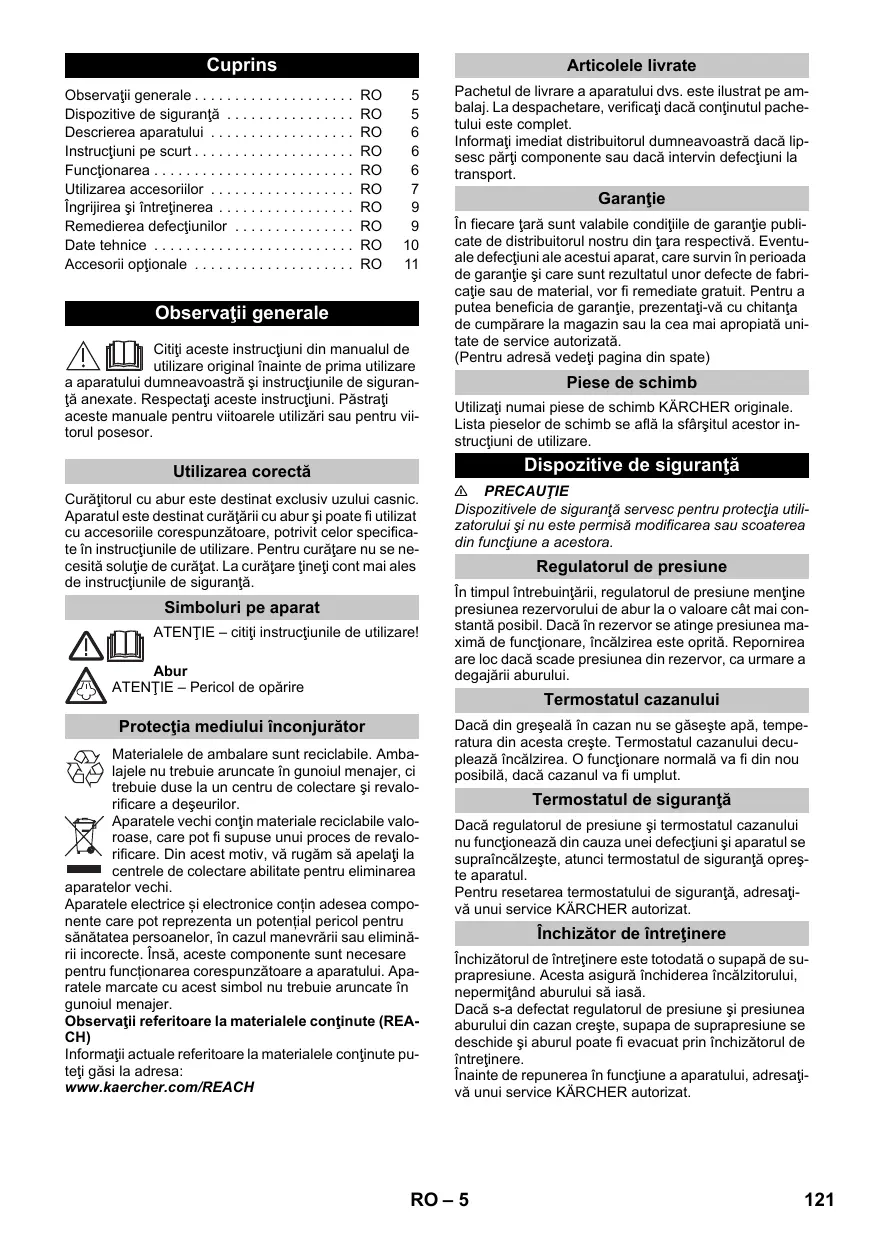 Observaţii generale Citiţi aceste instrucţiuni din manualul de utilizare original înainte de prima utilizare a aparatului dumneavoastră şi instrucţiunile de siguranţă anexate. Respectaţi aceste instrucţiuni. Păstraţi aceste manuale pentru viitoarele utilizări sau pentru viitorul posesor. Pachetul de livrare a aparatului dvs. este ilustrat pe ambalaj. La despachetare, verificaţi dacă conţinutul pachetului este complet. Informaţi imediat distribuitorul dumneavoastră dacă lipsesc părţi componente sau dacă intervin defecţiuni la transport. Garanţie În fiecare ţară sunt valabile condiţiile de garanţie publicate de distribuitorul nostru din ţara respectivă. Eventuale defecţiuni ale acestui aparat, care survin în perioada de garanţie şi care sunt rezultatul unor defecte de fabricaţie sau de material, vor fi remediate gratuit. Pentru a putea beneficia de garanţie, prezentaţi-vă cu chitanţa de cumpărare la magazin sau la cea mai apropiată unitate de service autorizată. (Pentru adresă vedeţi pagina din spate) Piese de schimb Utilizaţi numai piese de schimb KÄRCHER originale. Lista pieselor de schimb se află la sfârşitul acestor instrucţiuni de utilizare. Dispozitive de siguranţă Utilizarea corectă Curăţitorul cu abur este destinat exclusiv uzului casnic. Aparatul este destinat curăţării cu abur şi poate fi utilizat cu accesoriile corespunzătoare, potrivit celor specificate în instrucţiunile de utilizare. Pentru curăţare nu se necesită soluţie de curăţat. La curăţare ţineţi cont mai ales de instrucţiunile de siguranţă. Simboluri pe aparat ATENŢIE – citiţi instrucţiunile de utilizare! Abur ATENŢIE – Pericol de opărire 몇 PRECAUŢIE Dispozitivele de siguranţă servesc pentru protecţia utilizatorului şi nu este permisă modificarea sau scoaterea din funcţiune a acestora. Regulatorul de presiune În timpul întrebuinţării, regulatorul de presiune menţine presiunea rezervorului de abur la o valoare cât mai constantă posibil. Dacă în rezervor se atinge presiunea maximă de funcţionare, încălzirea este oprită. Repornirea are loc dacă scade presiunea din rezervor, ca urmare a degajării aburului. Termostatul cazanului Protecţia mediului înconjurător Materialele de ambalare sunt reciclabile. Ambalajele nu trebuie aruncate în gunoiul menajer, ci trebuie duse la un centru de colectare şi revalorificare a deşeurilor. Aparatele vechi conţin materiale reciclabile valoroase, care pot fi supuse unui proces de revalorificare. Din acest motiv, vă rugăm să apelaţi la centrele de colectare abilitate pentru eliminarea aparatelor vechi. Aparatele electrice și electronice conțin adesea componente care pot reprezenta un potențial pericol pentru sănătatea persoanelor, în cazul manevrării sau eliminării incorecte. Însă, aceste componente sunt necesare pentru funcționarea corespunzătoare a aparatului. Aparatele marcate cu acest simbol nu trebuie aruncate în gunoiul menajer. Observaţii referitoare la materialele conţinute (REACH) Informaţii actuale referitoare la materialele conţinute puteţi găsi la adresa: www.kaercher.com/REACH Dacă din greşeală în cazan nu se găseşte apă, temperatura din acesta creşte. Termostatul cazanului decuplează încălzirea. O funcţionare normală va fi din nou posibilă, dacă cazanul va fi umplut. Termostatul de siguranţă Dacă regulatorul de presiune şi termostatul cazanului nu funcţionează din cauza unei defecţiuni şi aparatul se supraîncălzeşte, atunci termostatul de siguranţă opreşte aparatul. Pentru resetarea termostatului de siguranţă, adresaţivă unui service KÄRCHER autorizat. Închizător de întreţinere Închizătorul de întreţinere este totodată o supapă de suprapresiune. Acesta asigură închiderea încălzitorului, nepermiţând aburului să iasă. Dacă s-a defectat regulatorul de presiune şi presiunea aburului din cazan creşte, supapa de suprapresiune se deschide şi aburul poate fi evacuat prin închizătorul de întreţinere. Înainte de repunerea în funcţiune a aparatului, adresaţivă unui service KÄRCHER autorizat. RO – 5