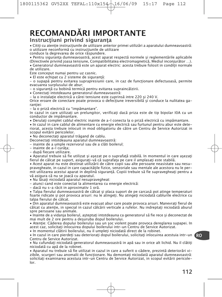 • Citiţi cu atenţie instrucţiunile de utilizare anterior primei utilizări a aparatului dumneavoastră: o utilizare neconformă cu instrucţiunile de utilizare conduce la degrevarea de orice răspundere. • Pentru siguranţa dumneavoastră, acest aparat respectă normele şi reglementările aplicabile (Directivele privind joasa tensiune, Compatibilitatea electromagnetică, Mediul inconjurător …). • Generatorul dumneavoastră este un aparat electric: acesta trebuie folosit in condiţii normale de utilizare. Este conceput numai pentru uz casnic. • El este echipat cu 2 sisteme de siguranţă: - o supapă pentru evitarea suprapresiunii care, in caz de funcţionare defectuoasă, permite evacuarea surplusului de abur; - o siguranţă cu bobină termică pentru evitarea supraincălzirii. • Conectaţi intotdeauna generatorul dumneavoastră: - la o instalaţie electrică a cărei tensiune este cuprinsă intre 220 şi 240 V. Orice eroare de conectare poate provoca o defecţiune ireversibilă şi conduce la nulitatea garanţiei: - la o priză electrică cu “impămantare”. In cazul in care utilizaţi un prelungitor, verificaţi dacă priza este de tip bipolar I0A cu un conductor de impămantare. • Derulaţi complet cablul electric inainte de a-l conecta la o priză electrică cu impămantare. • In cazul in care cablul de alimentare cu energie electrică sau furtunul pentru abur este deteriorat, acesta trebuie inlocuit in mod obligatoriu de către un Centru de Service Autorizat in scopul evitării pericolelor. • Nu deconectaţi aparatul trăgand de cablu. Deconectaţi intotdeauna aparatul dumneavoastră: - inainte de a umple rezervorul sau de a clăti boilerul; - inainte de a-l curăţa; - după fiecare utilizare. • Aparatul trebuie să fie utilizat şi aşezat pe o suprafaţă stabilă. In momentul in care aşezaţi fierul de călcat pe suport, asiguraţi-vă că suprafaţa pe care il amplasaţi este stabilă. • Acest aparat nu este destinat utilizării de către copii sau alte persoane neasistate sau nesupravegheate, in cazul in care capacităţile fizice, senzoriale sau mentale ale acestora nu le permit utilizarea acestui aparat in deplină siguranţă. Copiii trebuie să fie supravegheaţi pentru a vă asigura că nu se joacă cu aparatul. • Nu lăsaţi niciodată aparatul nesupravegheat: - atunci cand este conectat la alimentarea cu energie electrică: - dacă nu s-a răcit in aproximativ 1 oră. • Talpa fierului dumneavoastră de călcat şi placa suport de pe carcasă pot atinge temperaturi foarte ridicate şi pot provoca arsuri: nu le atingeţi. Nu atingeţi niciodată cablurile electrice cu talpa fierului de călcat. • Din aparatul dumneavoastră este evacuat abur care poate provoca arsuri. Manevraţi fierul de călcat cu atenţie, in special in cazul călcării verticale a rufelor. Nu indreptaţi niciodată aburul spre persoane sau animale. • Inainte de a vidanja boilerul, aşteptaţi intotdeauna ca generatorul să fie rece şi deconectat de mai mult de 2 ore pentru a deşuruba dopul boilerului. • Atenţie: Căderea dopului boilerului sau un şoc violent poate provoca dereglarea supapei. In acest caz, solicitaţi inlocuirea dopului boilerului intr-un Centru de Service Autorizat. • In momentul clătirii boilerului, nu il umpleţi niciodată direct de la robinet. • In cazul in care pierdeţi sau deterioraţi dopul boilerului, solicitaţi inlocuirea acestuia intr-un Centru de Service Autorizat. • Nu cufundaţi niciodată generatorul dumneavoastră in apă sau in orice alt lichid. Nu il clătiţi niciodată cu apă de la robinet. • Aparatul nu trebuie să fie utilizat in cazul in care a suferit o cădere, prezintă deteriorări vizibile, scurgeri sau anomalii de funcţionare. Nu demontaţi niciodată aparatul dumneavoastră: solicitaţi examinarea acestuia intr-un Centru de Service Autorizat, in scopul evitării pericolelor.