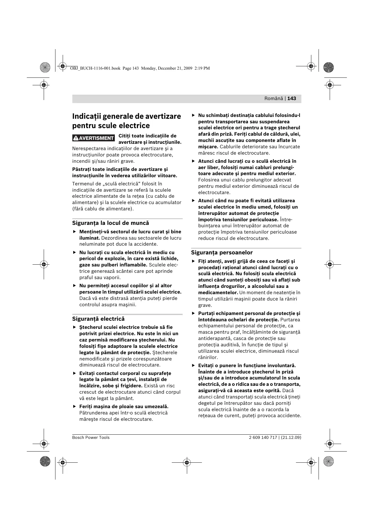 Romänä | 143 > Nu schimbati destinatia cablului folosindu-I pentru transportarea sau suspendarea sculei electrice ori pentru a trage stecherul afarä din prizä. Feriti cablul de cäldurä, ulei, muchii ascutite sau componente aflate în miscare. Cablurile deteriorate sau incurcate märesc riscul de electrocutare. > Atunci când lucrati cu o sculä electricä în aer liber, folositi numai cabluri prelungi- toare adecvate si pentru mediul exterior. Folosirea unui cablu prelungitor adecvat pentru mediul exterior diminueazä riscul de electrocutare. > Atunci când nu poate fi evitatà utilizarea sculei electrice in mediu umed, folositi un intrerupätor automat de protectie impotriva tensiunilor periculoase. între- buintarea unui intrerupätor automat de protectie impotriva tensiunilor periculoase reduce riscul de electrocutare. Siguranta persoanelor > Fiti atenti, aveti grijä de ceea ce faceti si procedati rational atunci când lucrati cu o scula electricä atunci când sunteti obositi sau vä aflati sub influenta drogurilor, a alcoolului sau a medicamentelor. Un moment de neatentie în timpul utilizärii maginii poate duce la räniri grave > Purtati echipament personal de protectie si intotdeauna ochelari de protectie. Purtarea echipamentului personal de protectie, ca masca pentru praf, Incältäminte de sigurantä antiderapantä, casca de protectie sau protectia auditivä, in functie de tipul si utilizarea sculei electrice, diminueazä riscul ränirilor. > Evitati o punere in functiune involuntarä. inainte de a introduce stecherul in prizä si/sau de a introduce acumulatorul in scula electricä, de a o ridica sau de a o transporta, asigurati-vä cä aceasta este opritä. Dacä atunci când transportati scula electricà tineti degetul pe intrerupätor sau dacä porniti scula electricä inainte de à o racorda la reteaua de curent, puteti provoca accidente. Bosch Power Tools 2 609 140 717 | (21.12.09) le.
