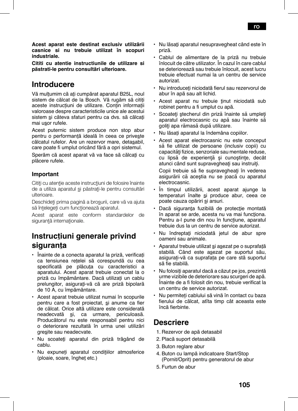 Acest aparat este destinat exclusiv utilizãrii casnice si nu trebuie utilizat în scopuri industriale. Cititi cu atentie instructiunile de utilizare si pãstrati-le pentru consultãri ulterioare. Introducere Vã multumim cã ati cumpãrat aparatul B25L, noul sistem de cãlcat de la Bosch. Vã rugãm sã cititi aceste instructiuni de utilizare. Contin informatii valoroase despre caracteristicile unice ale acestui sistem si câteva sfaturi pentru ca dvs. sã cãlcati mai usor rufele. Acest puternic sistem produce non stop abur pentru o performantã idealã în ceea ce priveste cãlcatul rufelor. Are un rezervor mare, detasabil, care poate fi umplut oricând fãrã a opri sistemul. Sperãm cã acest aparat vã va face sã cãlcati cu plãcere rufele. Important Cititi cu atentie aceste instructiuni de folosire înainte de a utiliza aparatul si pãstrati-le pentru consultãri ulterioare. Deschideti prima paginã a brosurii, care vã va ajuta sã întelegeti cum functioneazã aparatul. Acest aparat este conform standardelor de sigurantã internationale. Instructiuni generale privind siguranta