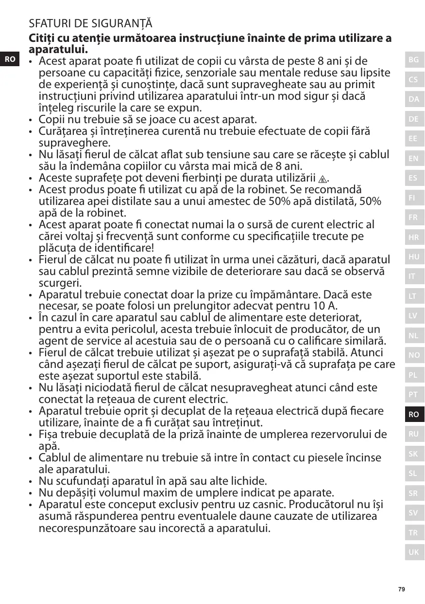 • Cet appareil peut être utilisé par des enfants âgés de 8 ans et plus ainsi que par des personnes dont les facultés physiques, sensorielles ou mentales sont réduites, ou qui manquent d’expérience et de connaissances, à condition qu’elles soient sous la surveillance d’une personne responsable ou aient reçu des instructions concernant l’utilisation correcte de l’appareil et comprennent les dangers inhérents. • Ne laissez pas les enfants jouer avec l’appareil. • Les enfants ne doivent pas effectuer le nettoyage ni la maintenance de l’appareil sans supervision. • Le fer et son cordon doivent être conservés hors de portée des enfants âgés de moins de 8 ans lorsque l’appareil est en cours de fonctionnement ou de refroidissement. • Les surfaces peuvent devenir chaudes pendant l’utilisation . • Ce produit peut être utilisé avec de l’eau du robinet. Il est recommandé d’utiliser de l’eau distillée, ou un mélange composé de 50 % d’eau distillée et de 50 % d’eau du robinet. • L’appareil doit être branché sur un réseau électrique correspondant à la tension et à la fréquence d’alimentation indiquées sur la plaque signalétique. • Le fer ne doit pas être utilisé s’il est tombé, si le fer ou le cordon d’alimentation portent des marques visibles de déterioration ou si le fer présente une fuite. • L’appareil doit être raccordé à la terre. Si nécessaire, il est possible d’utiliser une rallonge compatible 10 A. • Si l’appareil ou le cordon est endommagé, il doit être remplacé par le fabricant, l’un de ses réparateurs ou toute autre personne dûment qualifiée, afin d’éviter tout danger. • Le fer doit être utilisé et posé sur une surface stable. Lorsque le fer est placé sur son support, veillez à ce que la surface sur laquelle est placé le support soit stable. • Ne jamais laisser l’appareil sans surveillance lorsqu’il est raccordé à l’alimentation électrique. • Lorsqu’il n’est plus utilisé, éteindre et débrancher l’appareil avant de le nettoyer ou de procéder à son entretien. • Débrancher la fiche de la prise avant de remplir le réservoir d’eau. • Le cordon d’alimentation ne doit jamais entrer en contact avec les parties chaudes de l’appareil. • Ne pas plonger l’appareil dans l’eau ni dans aucun autre liquide. • Ne pas dépasser le niveau maximum de remplissage indiqué sur l’appareil. • Cet appareil est exclusivement destiné à un usage domestique. Le fabricant décline toute responsabilité en cas de dommages résultant d’une utilisation incorrecte de l’appareil.