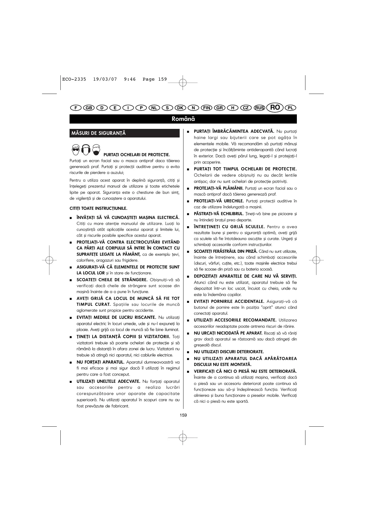 ÎNVĂŢAŢI SĂ VĂ CUNOAŞTEŢI MAŞINA ELECTRICĂ. Citiţi cu mare atenţie manualul de utilizare. Luaţi la cunoştinţă atât aplicaţiile acestui aparat şi limitele lui, cât şi riscurile posibile specifice acestui aparat. PROTEJAŢI-VĂ CONTRA ELECTROCUTĂRII EVITÂND CA PĂRŢI ALE CORPULUI SĂ INTRE ÎN CONTACT CU SUPRAFEŢE LEGATE LA PĂMÂNT, ca de exemplu ţevi, calorifere, aragazuri sau frigidere.