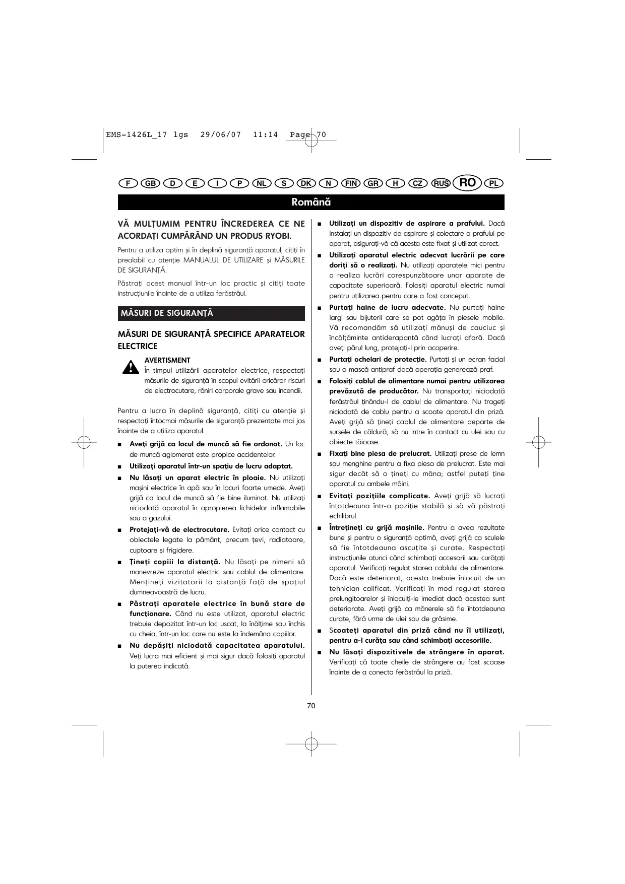 Română VĂ MULŢUMIM PENTRU ÎNCREDEREA CE NE ACORDAŢI CUMPĂRÂND UN PRODUS RYOBI. Pentru a utiliza optim şi în deplină siguranţă aparatul, citiţi în prealabil cu atenţie MANUALUL DE UTILIZARE şi MĂSURILE DE SIGURANŢĂ.
