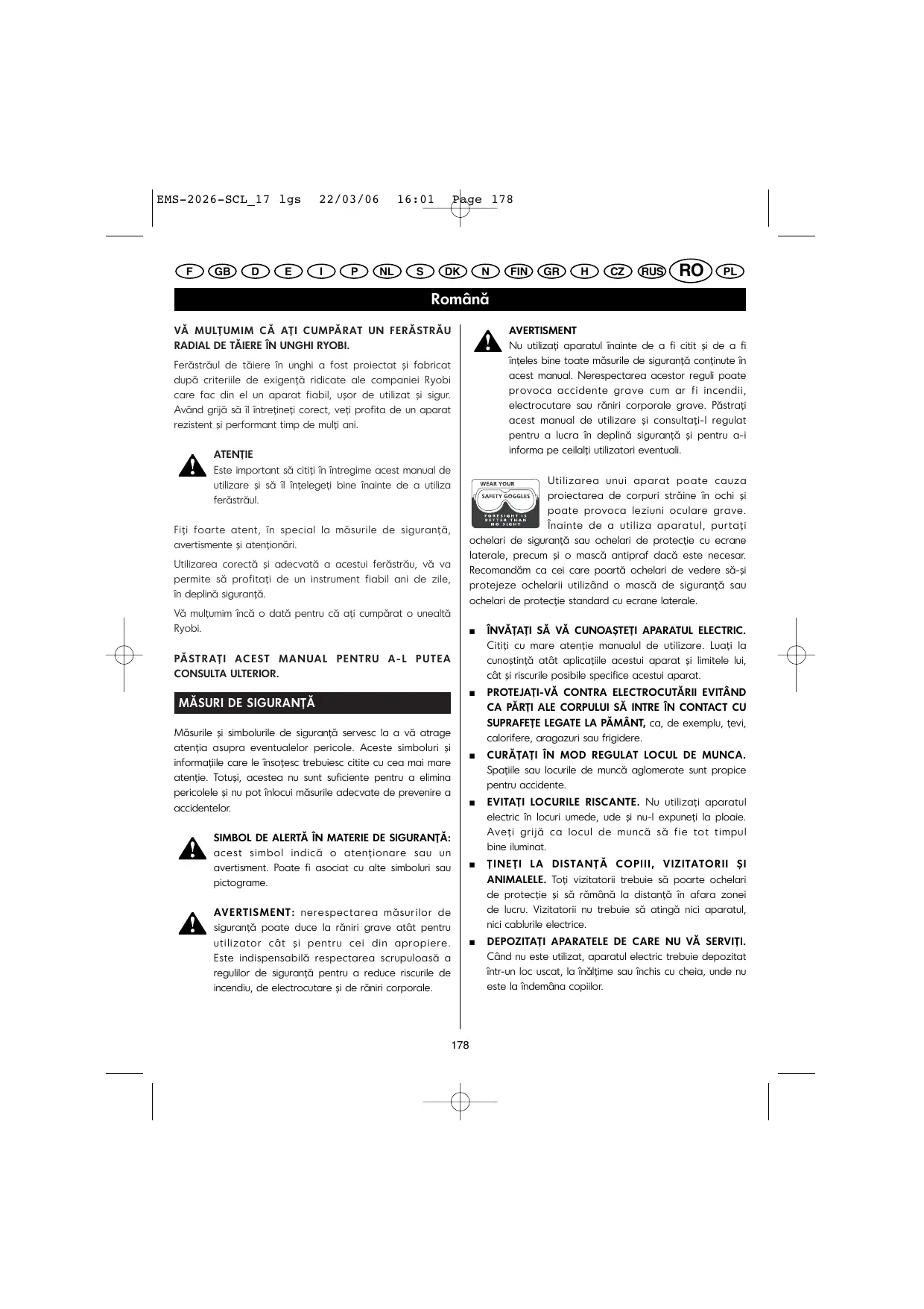 Română AVERTISMENT Nu utilizaţi aparatul înainte de a fi citit şi de a fi înţeles bine toate măsurile de siguranţă conţinute în acest manual. Nerespectarea acestor reguli poate provoca accidente grave cum ar fi incendii, electrocutare sau răniri corporale grave. Păstraţi acest manual de utilizare şi consultaţi-l regulat pentru a lucra în deplină siguranţă şi pentru a-i informa pe ceilalţi utilizatori eventuali. VĂ MULŢUMIM CĂ AŢI CUMPĂRAT UN FERĂSTRĂU RADIAL DE TĂIERE ÎN UNGHI RYOBI. Ferăstrăul de tăiere în unghi a fost proiectat şi fabricat după criteriile de exigenţă ridicate ale companiei Ryobi care fac din el un aparat fiabil, uşor de utilizat şi sigur. Având grijă să îl întreţineţi corect, veţi profita de un aparat rezistent şi performant timp de mulţi ani. ATENŢIE Este important să citiţi în întregime acest manual de utilizare şi să îl înţelegeţi bine înainte de a utiliza ferăstrăul. Utilizarea unui aparat poate cauza proiectarea de corpuri străine în ochi şi poate provoca leziuni oculare grave. Înainte de a utiliza aparatul, purtaţi ochelari de siguranţă sau ochelari de protecţie cu ecrane laterale, precum şi o mască antipraf dacă este necesar. Recomandăm ca cei care poartă ochelari de vedere să-şi protejeze ochelarii utilizând o mască de siguranţă sau ochelari de protecţie standard cu ecrane laterale. Fiţi foarte atent, în special la măsurile de siguranţă, avertismente şi atenţionări. Utilizarea corectă şi adecvată a acestui ferăstrău, vă va permite să profitaţi de un instrument fiabil ani de zile, în deplină siguranţă. Vă mulţumim încă o dată pentru că aţi cumpărat o unealtă Ryobi.