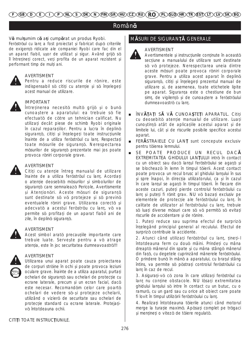 AVERTISMENT Citiái cu atenáie întreg manualul de utilizare înainte de a utiliza ferßstrßul cu laná. Acordaái o atenáie deosebitß mßsurilor Ýi simbolurilor de siguranáß care semnaleazß Pericole, Avertismente Ýi Atenáionßri. Aceste mßsuri de siguranáß sunt destinate sß vß protejeze Ýi sß previnß eventualele rßniri grave. Utilizarea corectß Ýi adecvatß a acestui ferßstrßu cu laná, vß va permite sß profitaái de un aparat fiabil ani de zile, în deplinß siguranáß. AVERTISMENT Acest simbol aratß precauáiile importante care trebuie luate. ServeÝte pentru a vß atrage atenáia, este în joc securitatea dumneavoastrß!!! AVERTISMENT Utilizarea unui aparat poate cauza proiectarea de corpuri strßine în ochi Ýi poate provoca leziuni oculare grave. Înainte de a utiliza aparatul, purtaái ochelari de siguranáß sau ochelari de protecáie cu ecrane laterale, precum Ýi un ecran facial, dacß este necesar. Recomandßm celor care poartß ochelari de vedere sß-Ýi protejeze ochelarii, utilizând o vizierß de securitate sau ochelari de protecáie standard cu ecrane laterale. Protejaáivß întotdeauna ochii. CITIàI TOATE INSTRUCàIUNILE.
