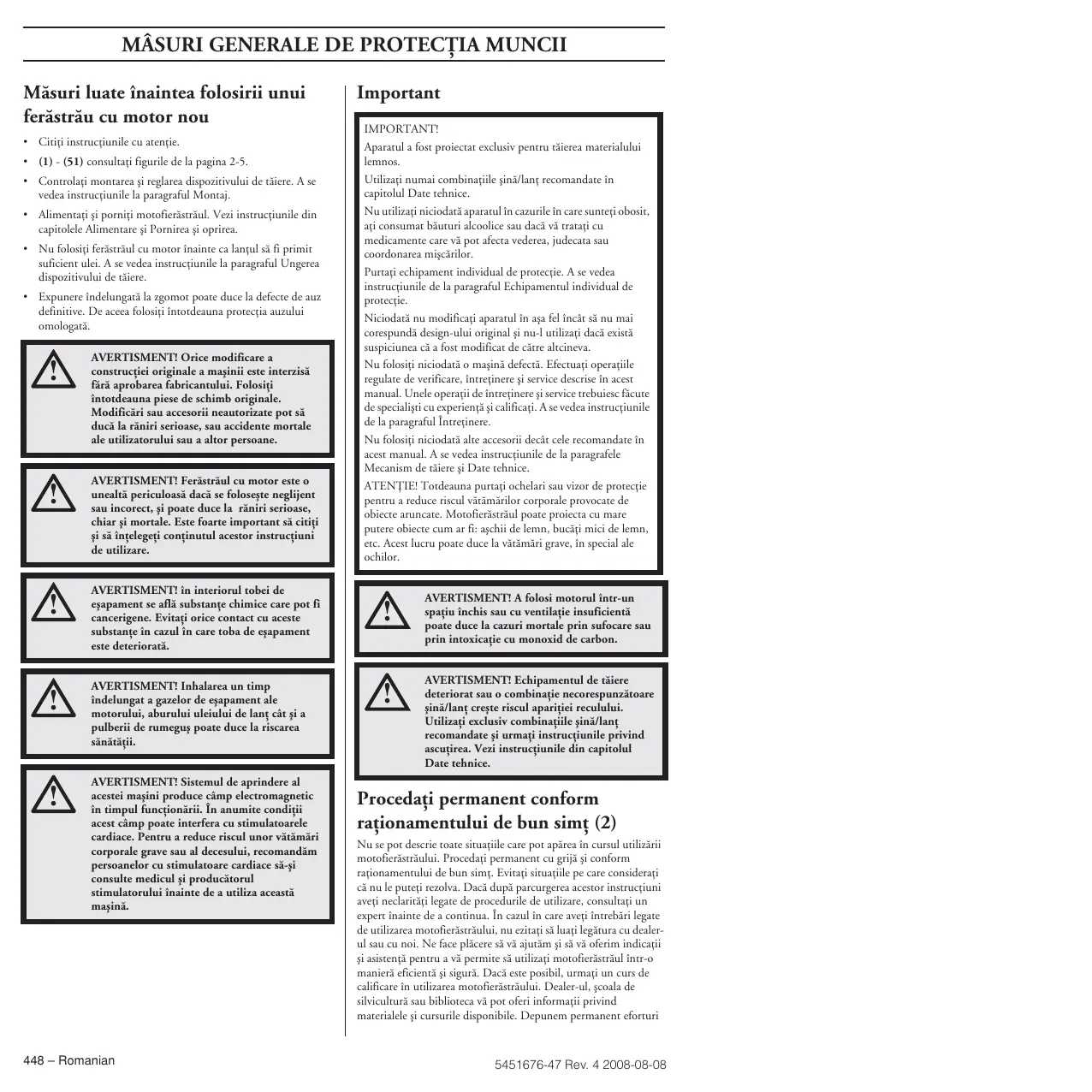 IMPORTANT! AAcest capirol trateazä reguli de bazä de sigurançä pentru lucrul cu erästräul cu motor. Informagia datä nu poate niciodatä inlocui acele cunogtiinte pe care un meserias le acumuleazä prin studiu si experienfä practicä. Atunci când vä aflagi in faça unei situaçi in care nu suntefisigur de modul de continuare a folosiri, trebuie sà consulat un specialist. Adresagi-va magazinului de vânzare, atelierului de service sau unui utlizator cu experiengä al ferästräului cu motor. Evitafi orice folosire pentru care va simfii insuficient calificat!